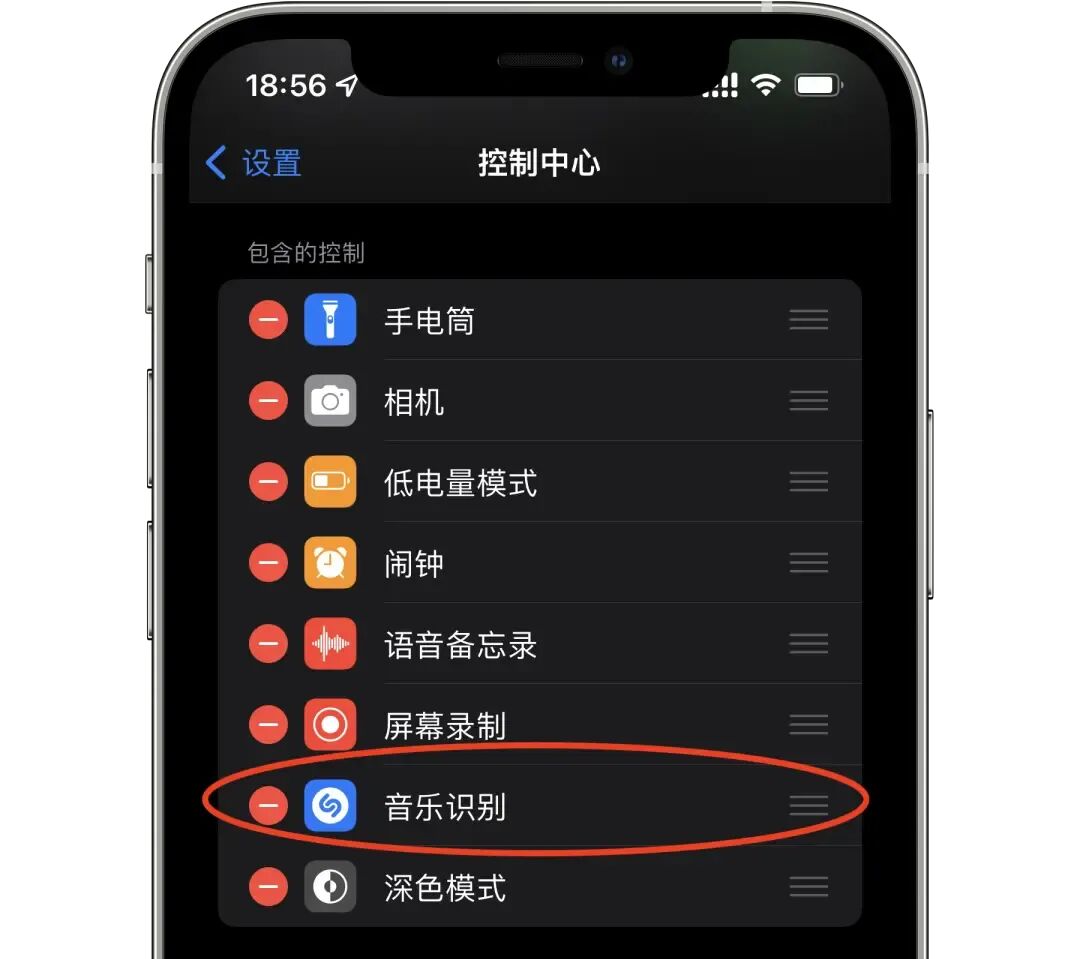 前往设置 - 控制中心,看看 “音乐识别” 这个功能是不是已经被添加到 “包含的控制” 中,没有添加的话点击左侧的绿色 + 号即可。