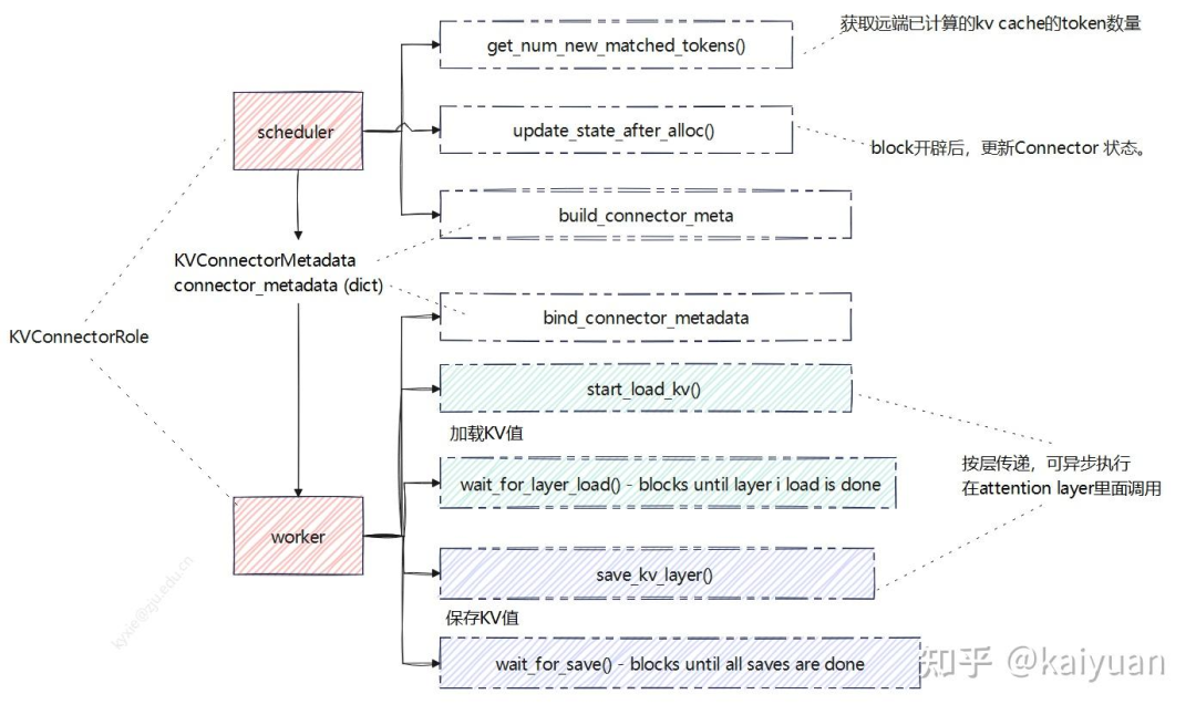 scheduler 侧方法:build_connector_meta:构建元数据,scheduler 告诉 worker 需要保持/加载哪些 KV cache。 get_num_new_matched_tokens:获取远端已计算的 KV cache 的 token 数量。 update_state_after_alloc:block 开辟后,更新 connector 的状态。 worker 侧方法:start_load_kv :从 connector buffer 加载 KV cache,消费端调用。wait_for_layer_load:阻塞直到指定层加载结束,消费端调用; save_kv_layer :将 vLLM 的 KV buffer 中某一层的 KV cache 保存到 connector buffer 中,生产端调用。wait_for_save:阻塞直到所有保存操作完成,生产端调用。 vLLM v1 中 connector 有两个执行角色(Role):scheduler_connector 和 worker_connector,分别在 scheduler 线程和 worker 线程中执行。scheduler 负责指挥 worker 进行 KV cache 的传递,两者之间的信息桥梁是元数据(KVConnectorMetadata),worker 通过 metadata 知道哪些 KV 值需要从远端加载。