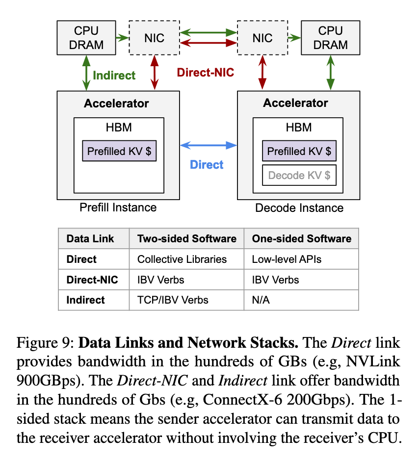 Direct ,即 GPU 之间通过高速直连链路(如 NVLink 或 HCCS)相互连接。在这种情况下,可以利用底层的内存拷贝原语或集体通信库来完成数据传输。Direct-NIC ,即 GPU 通过其配套的网卡(NIC)进行通信。在这里,可以使用定制化的库,通过 PCIe 和以太网(或 InfiniBand)进行数据传输。Indirect ,即当 GPU 之间没有直接链路时,必须通过其 CPU 的 DRAM 中转数据,从而带来额外的内存拷贝开销。图片来源:Inference without Interference: Disaggregate LLM Inference for Mixed Downstream Workloads