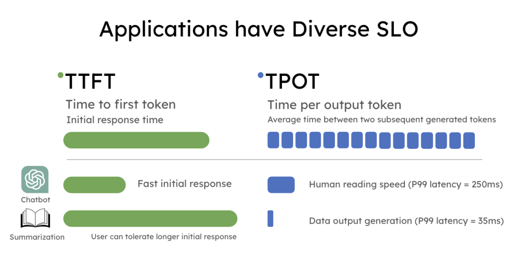 实际上,下游应用的类型多种多样,它们在用户体验上的延迟需求各异,因此需要满足的服务等级目标(SLO)也存在显著差异。大模型服务中最常用的 SLO 包括: