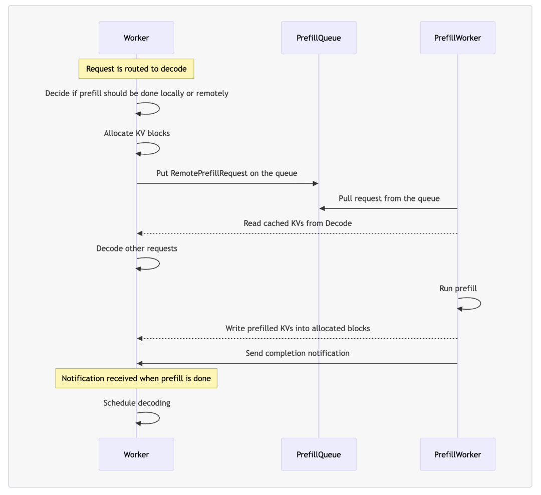 没有干扰 :prefill 和 decode 各自独立运行,更快地完成计算,也更容易满足各自的 SLO。资源分配与并行策略解耦 :可以针对 prefill 和 decode 分别进行优化。当一个请求到达系统时,它会先被分配到 prefill worker 完成 prefill 阶段;随后系统将其中间状态(主要是 KV Cache)迁移到 decode worker,并执行多步 decode 以生成后续 token;当生成完成后,请求才会离开系统。