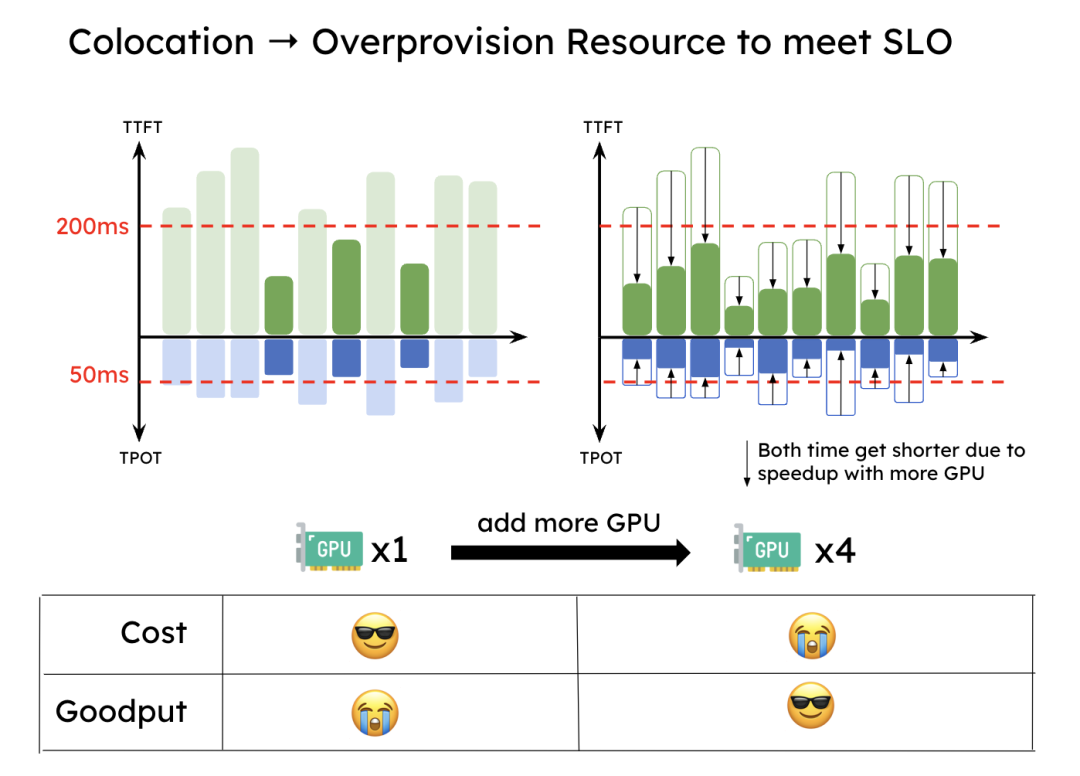 由于这种干扰,如下图所示,当服务必须同时满足 TTFT 和 TPOT 的 SLO 时,系统往往需要进行资源的过度配置才能达到延迟目标 ,尤其是在任一 SLO 要求较严格的情况下。