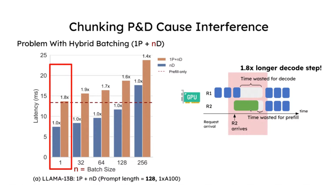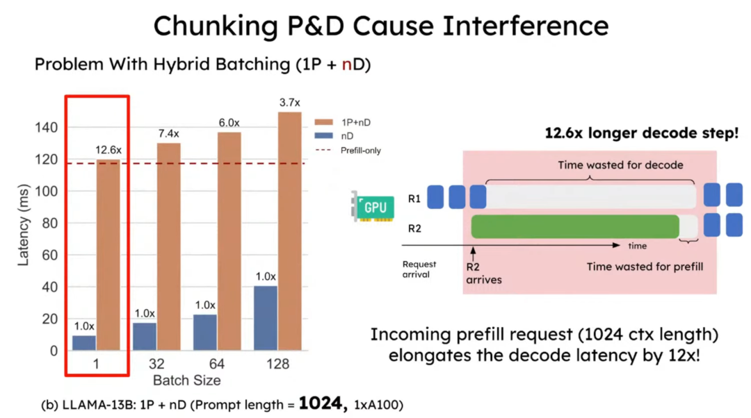1P+nD(棕色柱子):1 个 prefill 与 n 个 decode 混合批处理。 nD(蓝色柱子):仅包含 decode 请求的批处理。 prefill-only(红色虚线):仅运行 prefill 请求的延迟。 在 prompt 长度为 128 时,相比仅包含 decode 的请求,延迟增加约 1.8 倍;而当 prompt 长度为 1024 时,干扰效应显著放大,decode 延迟提升至 12.6 倍。