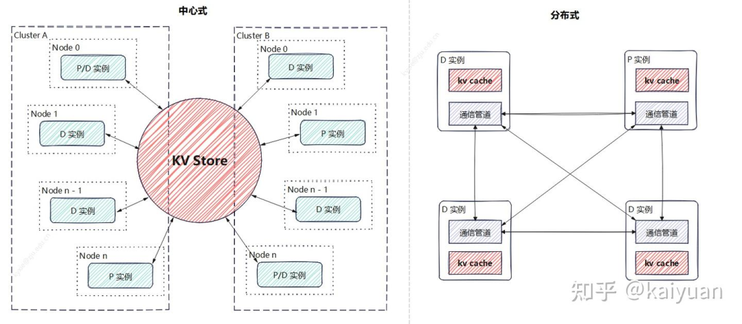 5.2 KV Cache 传输方式 目前 KV cache 的传输主要有两种方式:中心存储 和点对点(P2P) ,当然在实际系统中也可能采用二者结合的混合方案。