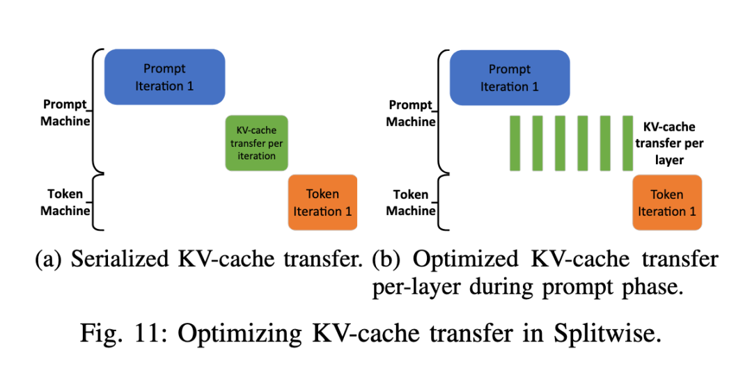 请求级 :等到 prefill 阶段完成后,将 KV cache 一次性传输。这种方式的好处是能够减少网络传输次数,因为每次传输的数据量更大,从而降低了通信开销。然而当 KV cache 大小较大时,会影响 TTFT 的延迟。层级 :Splitwise 通过在 prefill 阶段的计算与 KV cache 传输之间实现重叠来优化性能。每一层计算完成后,都会异步传输该层的 KV cache,同时继续执行下一层的计算,从而降低传输开销。 层级传输还能带来额外优势,例如更早启动 decode 阶段,以及更早释放 prefill 端的内存。层级 KV cache 传输与下一层的 prefill 计算并行进行,这需要逐层的细粒度同步以确保正确性,因此可能会带来性能干扰并增加 TTFT,尤其是在小 prompt 的场景下。不过对于小 prompt 来说,KV cache 的总体规模很小,不需要层级传输来隐藏延迟。由于在计算开始时批次中的 token 数已经是已知的,Splitwise 会选择最合适的 KV cache 传输方式:小 prompt 使用序列化传输,而大 prompt 使用层级传输。 图片来源:Splitwise: Efficient Generative LLM Inference Using Phase Splitting