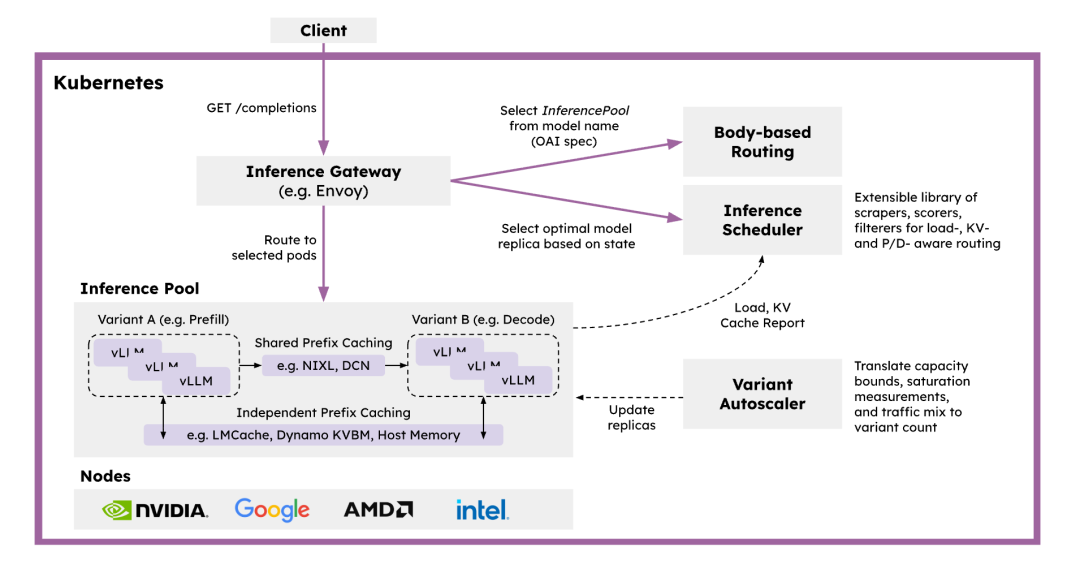 7.3 llm-d llm-d 是一个 Kubernetes 原生的分布式推理服务栈,为团队提供一条清晰高效的路径,以最快的落地速度在大规模环境中部署并管理推理服务。llm-d 通过集成业界标准的开源技术来加速分布式推理:使用 vLLM 作为模型服务与引擎,Inference Gateway 作为请求调度器与负载均衡器,Kubernetes 作为基础设施编排与工作负载控制平面。