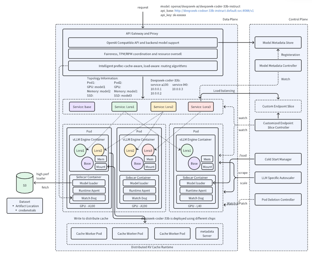 AIBrix 支持 LoRA 管理、前缀感知和负载感知的智能路由,并通过分布式 KV cache 实现跨节点的高效 token 复用。 在系统编排层面,AIBrix 结合 Kubernetes 与 Ray 的混合调度,既能满足大规模集群管理的需求,又能灵活执行细粒度任务。 AIBrix 基于 SLO 的 GPU 优化器与诊断工具进一步提升了资源利用率和系统可靠性。 使用 AIBrix 运行 PD 分离服务请参考:https://github.com/vllm-project/aibrix/tree/main/samples/disaggregation/vllm