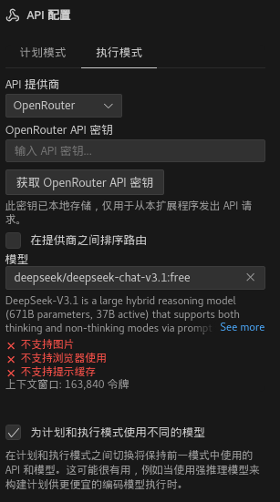 选择的是VS Code安装Cline,API提供商选择的是OpenRouter,关于OpenRouter的注册和使用可以参照《如何薅大模型API的羊毛?》。