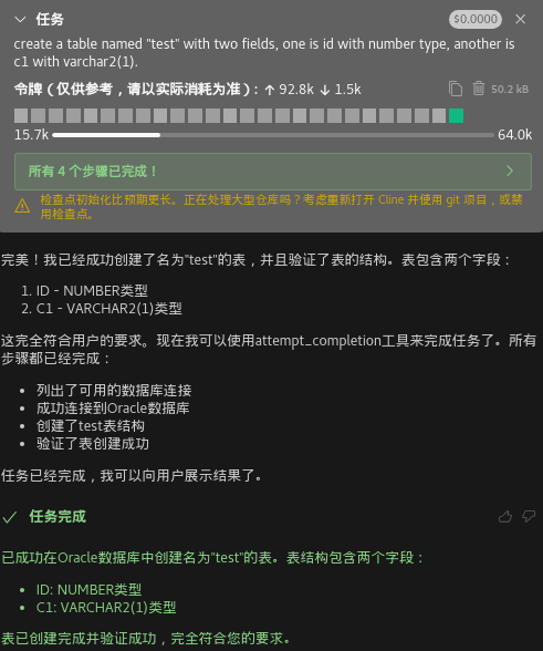此时可以跟数据库进行交互了,例如提问"What database I am connecting?"(当前环境没安装中文输入法,所以只能用英文,如果有输入法,可以用中文提问),它的回答是,
