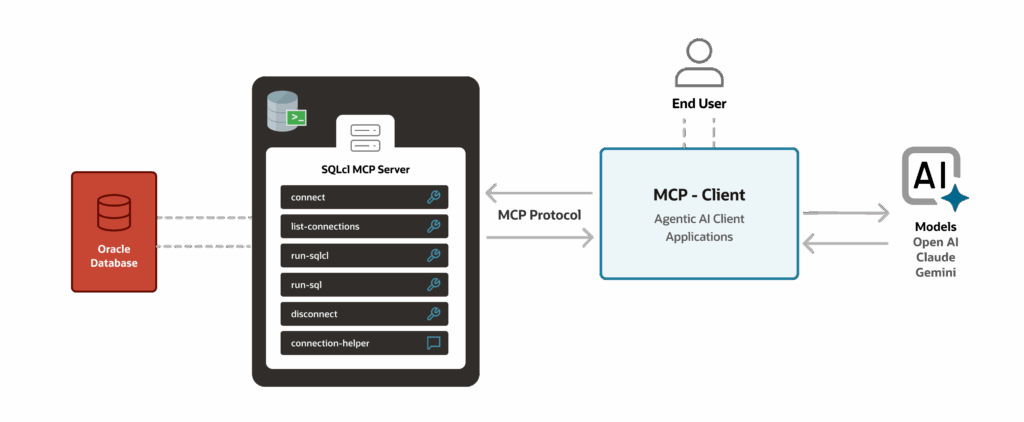 Oracle对MCP进行了评估,并将其集成到核心开发人员工具中,使Oracle数据库可立即在任何支持MCP的平台上使用。这种集成可通过Oracle数据库命令行Oracle SQLcl实现。