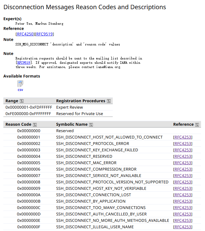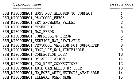 通过SSH远程登录的场景都需要遵照协议《Secure Shell (SSH) Protocol Parameters》,其中给出了Disconnection Messages Reason Codes and Descriptions和退出相关的原因定义,如下所示,