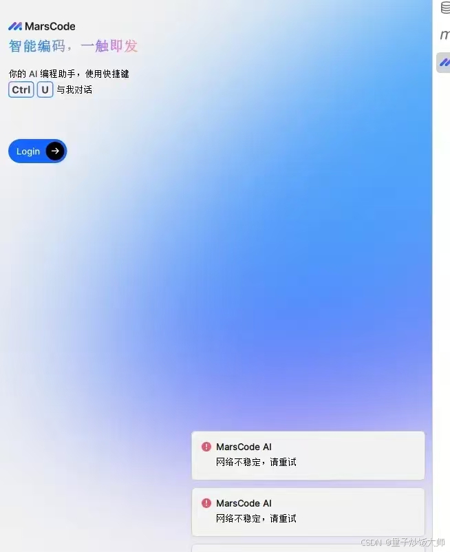 每次当我愉快的打开IDEA,准备我的代码好好优化一番时(将作业统统以AI代过的时候),我老是发现我的MarsCode不能用了,这对于我这种懒得写注释的成嘘猿来说犹如一道晴天霹雳,上网查了各种资料都没有具体的解决思路,甚至换个工具也是如此,