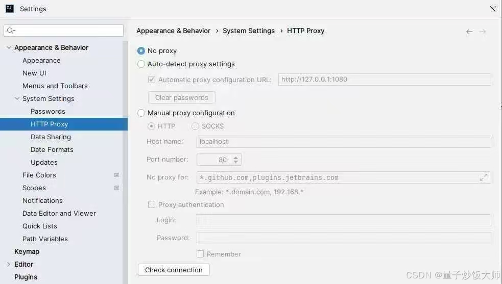 在跳出来的弹窗中,依次点击"Appearance&Behavior"——"System Settings"——"HTTP Proxy",在右侧窗口把"No proxy"给点上
