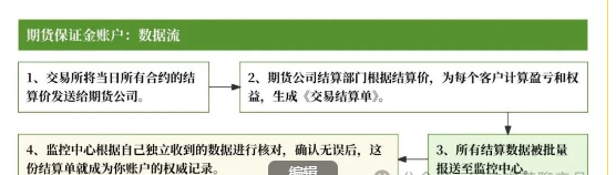 3、数据流:1、收盘后,交易所将所有投资者的盈亏汇总至交易所结算账户,再划付给期货公司结算账户;2、投资者持仓需缴纳的保证金,通过期货公司结算账户上存至交易所结算账户。