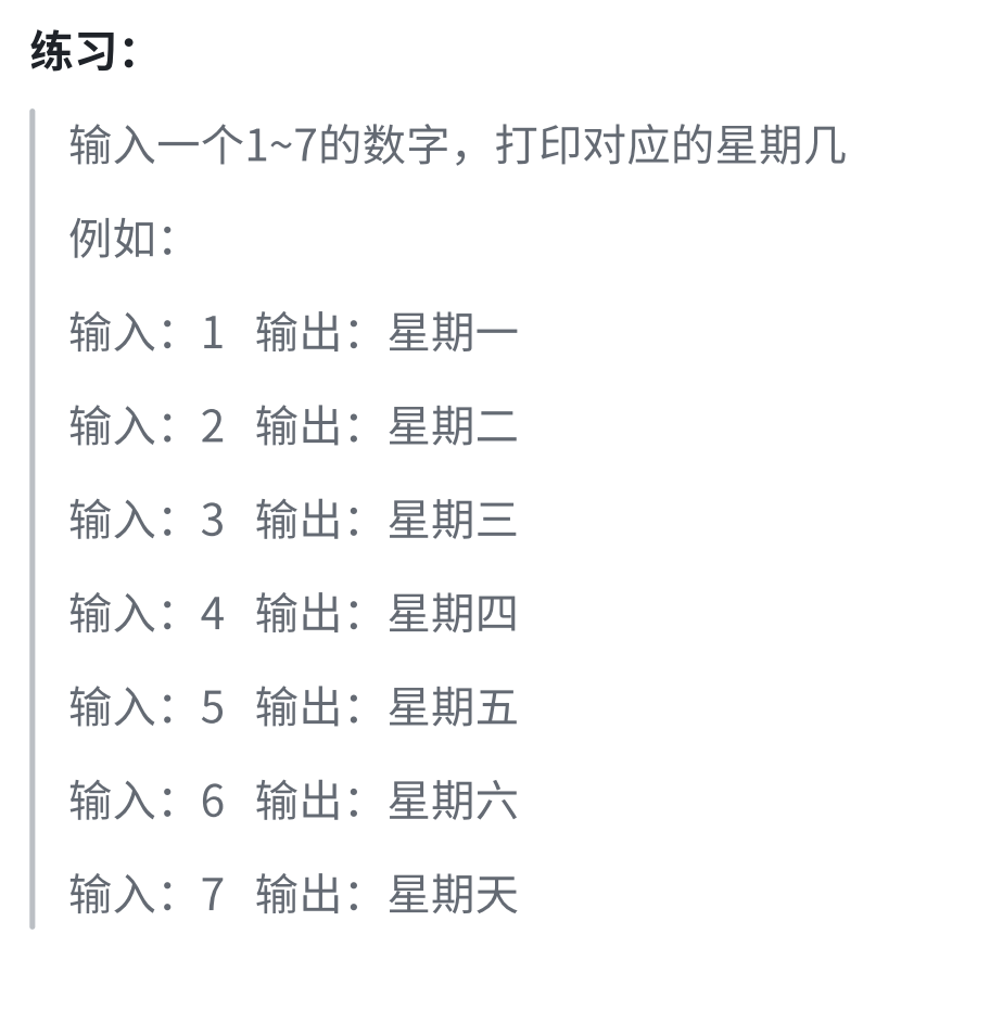 就比方说前面做的打印星期的练习,如果 day 的输入不是1~7的值,如果我们要提示:输入错误,则可以这样完成代码: