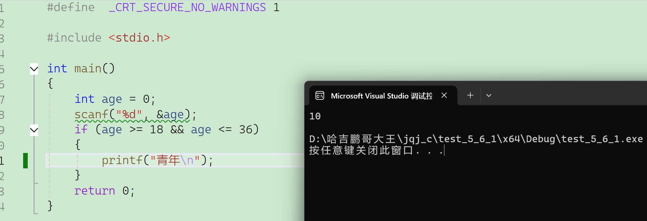 当我们输入一个值,以10为例,我们会发现,依然会输出青年——