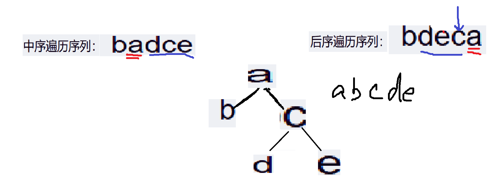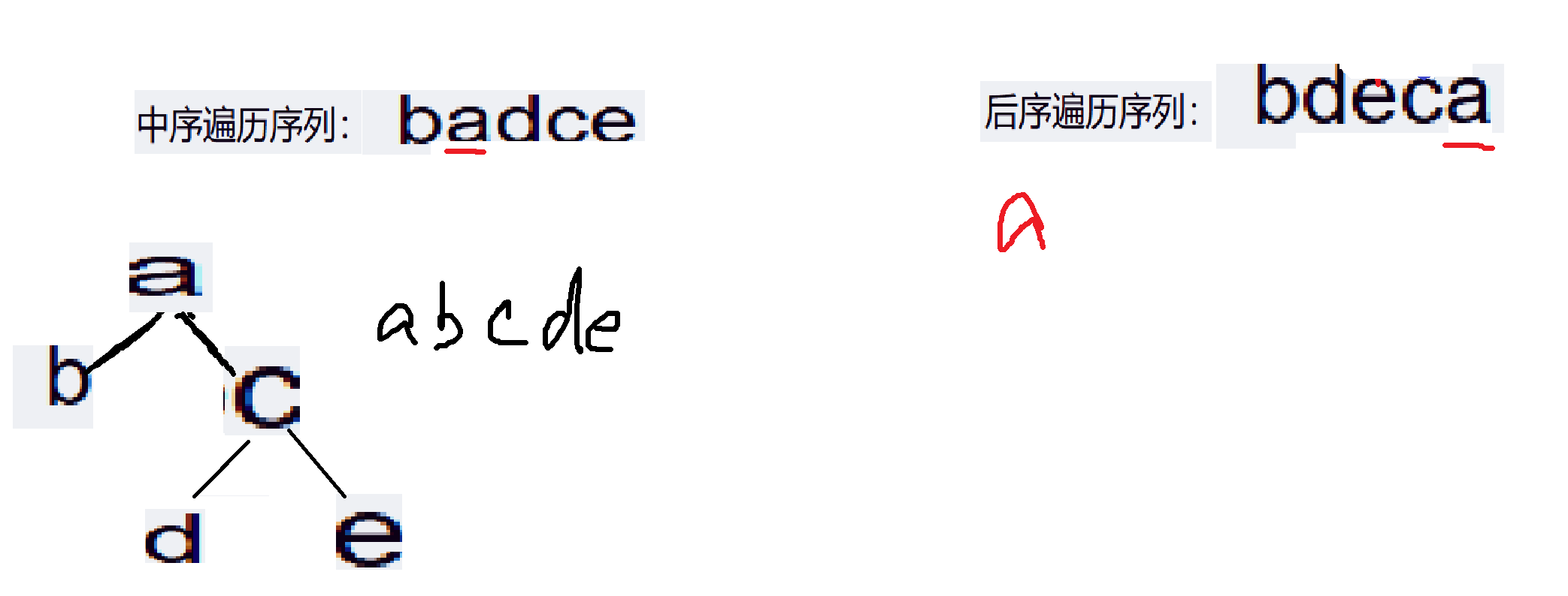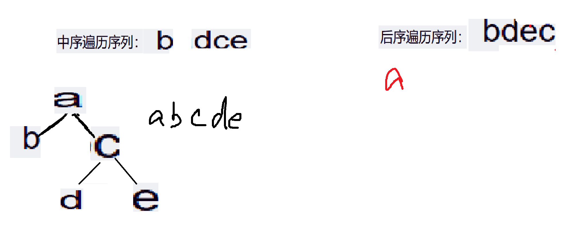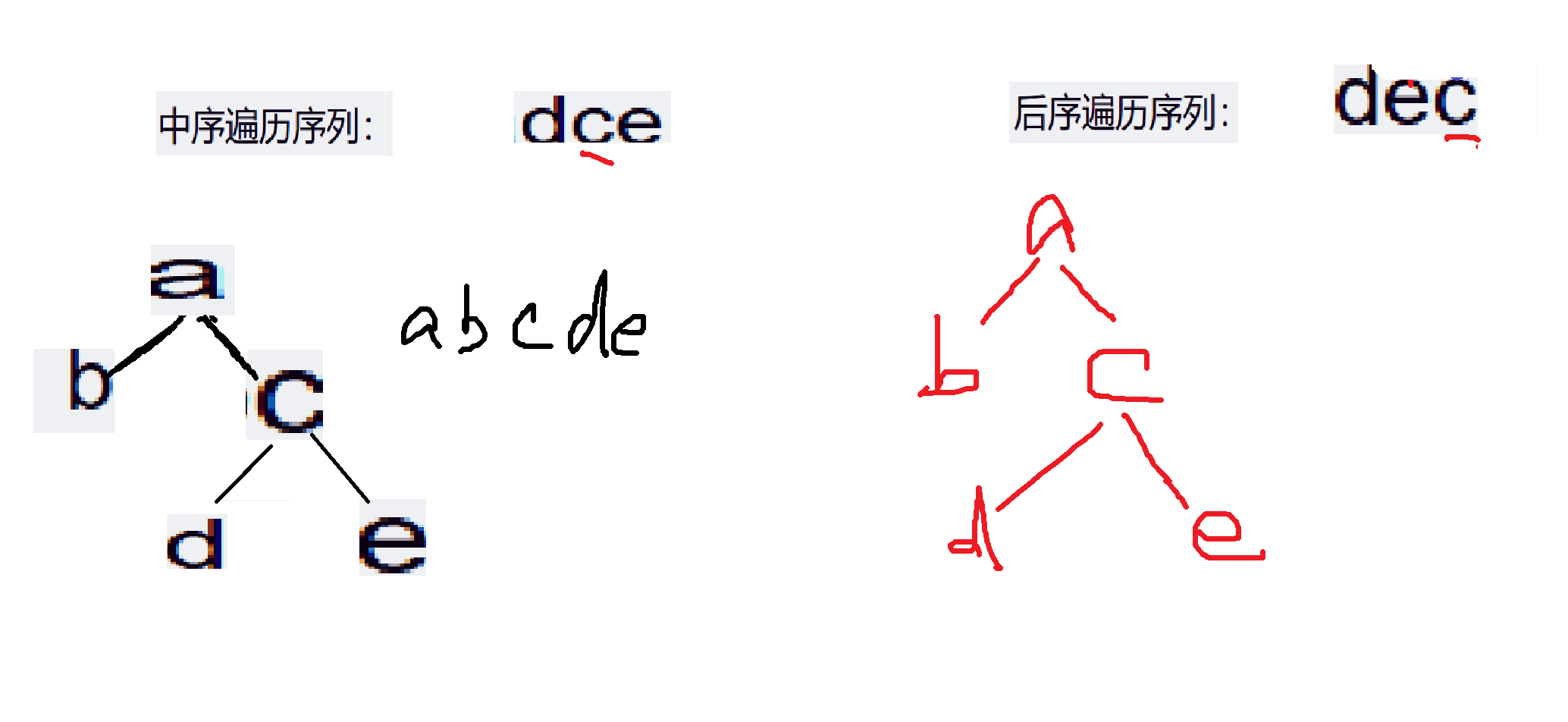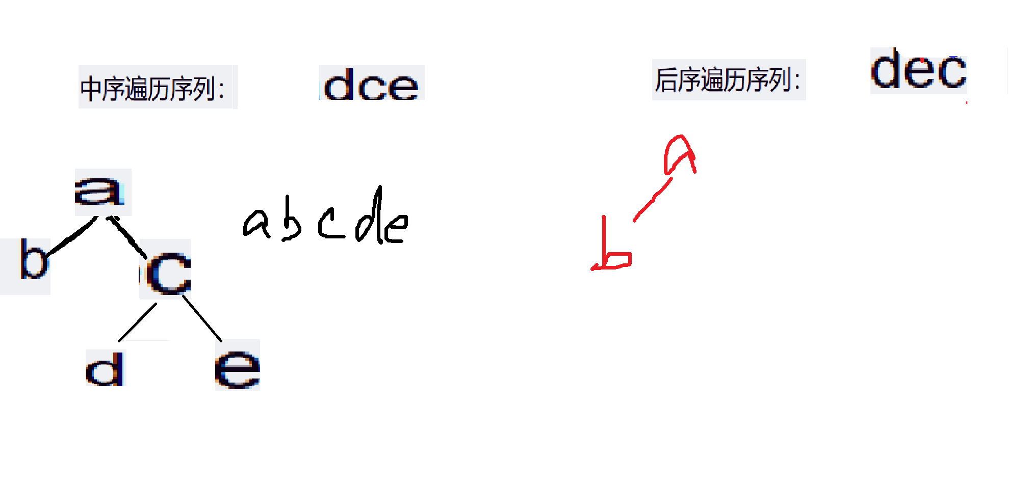 4、我们看:a的右子树,中序遍历的结果是dce,后序遍历的结果是dec,ab我们都删掉了,没有干扰项。dec,根节点是c,既然根节点是c,我们再回到中序遍历,c的左子树是d,c的右子树是e。后面大家做这种题目就可以采用这种方法。