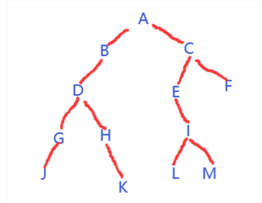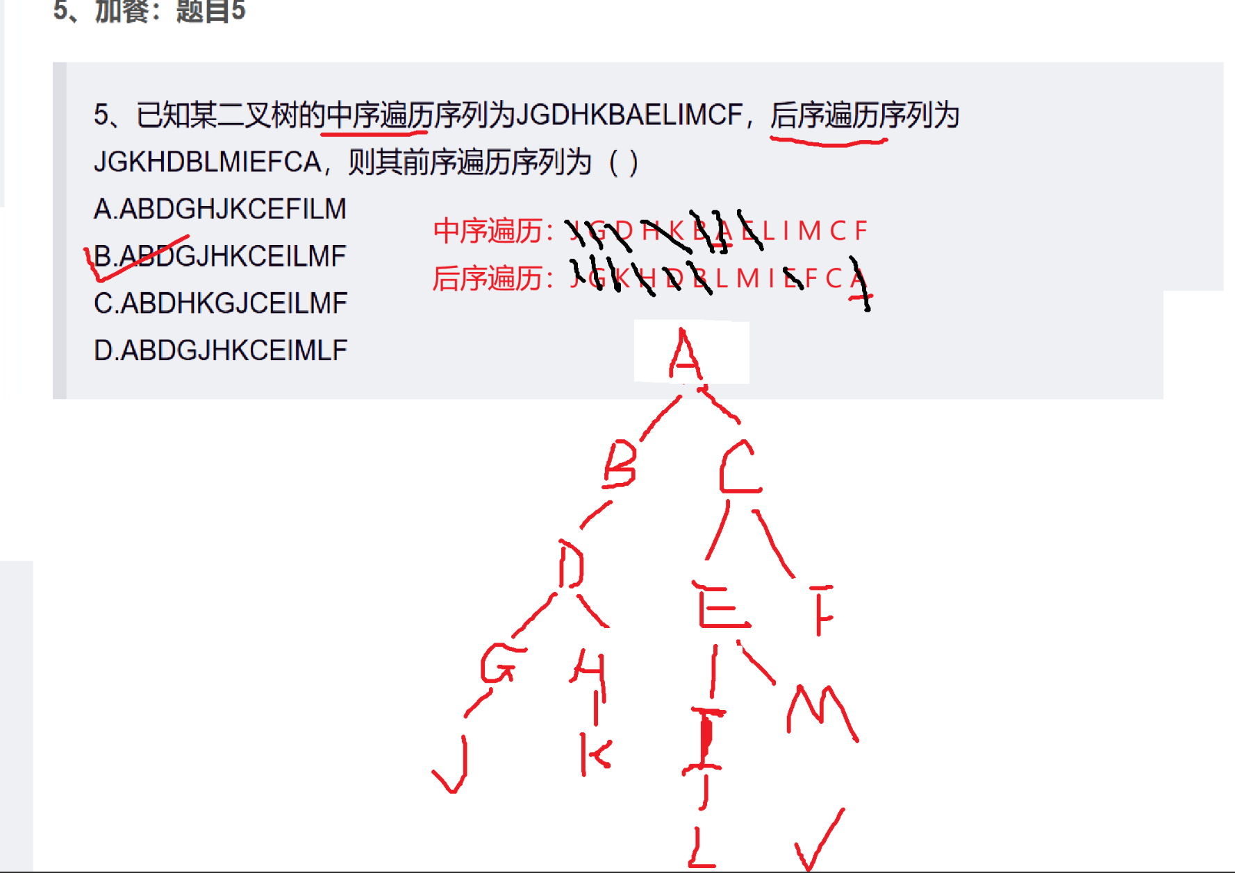 详解: 我们根据后序遍历可知,A是根节点—— A的左子树:JGDHKB,A的右子树:ELIMCF; A的左子树的根:B,A的右子树的根:C; B的左子树:JGDHK,B的右子树:空,C的左子树:ELIM,C的右子树:F; B的左子树的根:D,C的左子树根:E; D的左子树的根:G,D的右子树的根:H,E的右子树的根:I。