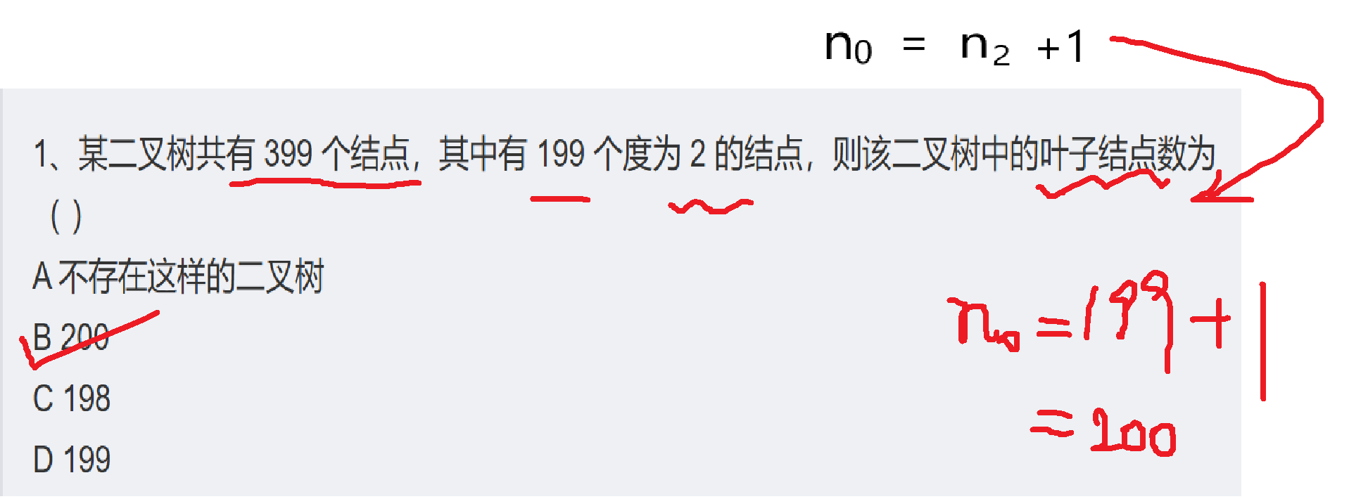 1、某二叉树共有 399 个结点,其中有 199 个度为 2 的结点,则该二叉树中的叶子结点数为( ) A 不存在这样的二叉树 B 200 C 198 D 199