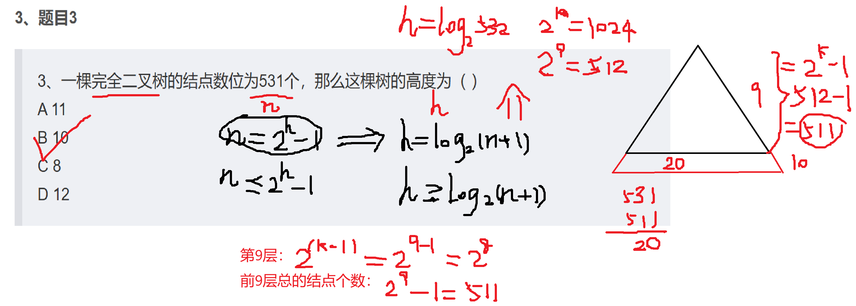 3、一棵完全二叉树的结点数位为531个,那么这棵树的高度为( ) A 11 B 10 C 8 D 12