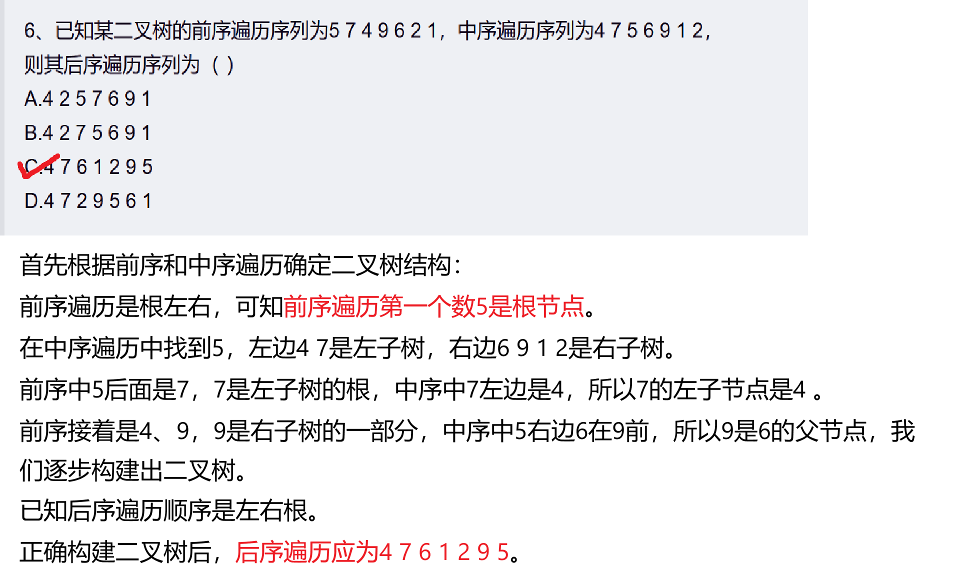 首先根据前序和中序遍历确定二叉树结构: 前序遍历是根左右,可知前序遍历第一个数5是根节点。 在中序遍历中找到5,左边4 7是左子树,右边6 9 1 2是右子树。 前序中5后面是7,7是左子树的根,中序中7左边是4,所以7的左子节点是4 。 前序接着是4、9,9是右子树的一部分,中序中5右边6在9前,所以9是6的父节点,我们逐步构建出二叉树。 已知后序遍历顺序是左右根。 正确构建二叉树后,后序遍历应为4 7 6 1 2 9 5。