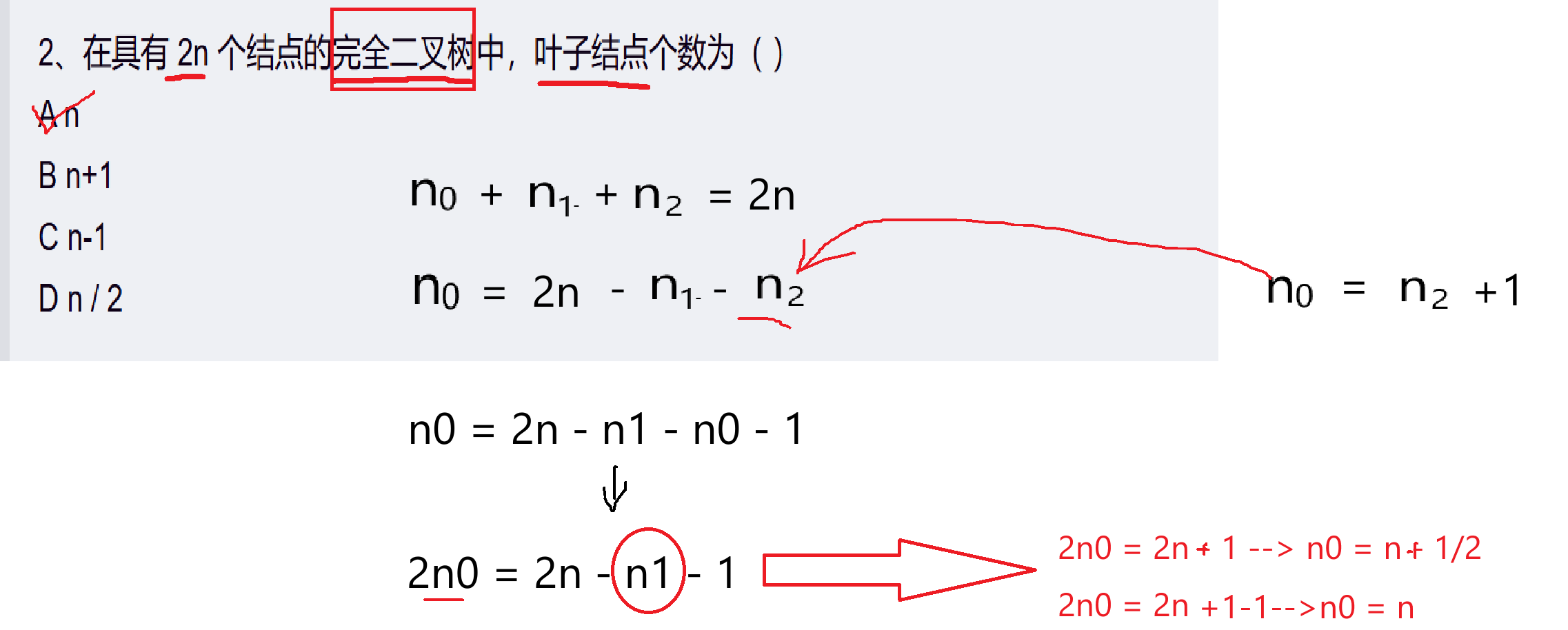 2、在具有 2n 个结点的完全二叉树中,叶子结点个数为( ) A n B n+1 C n-1 D n / 2