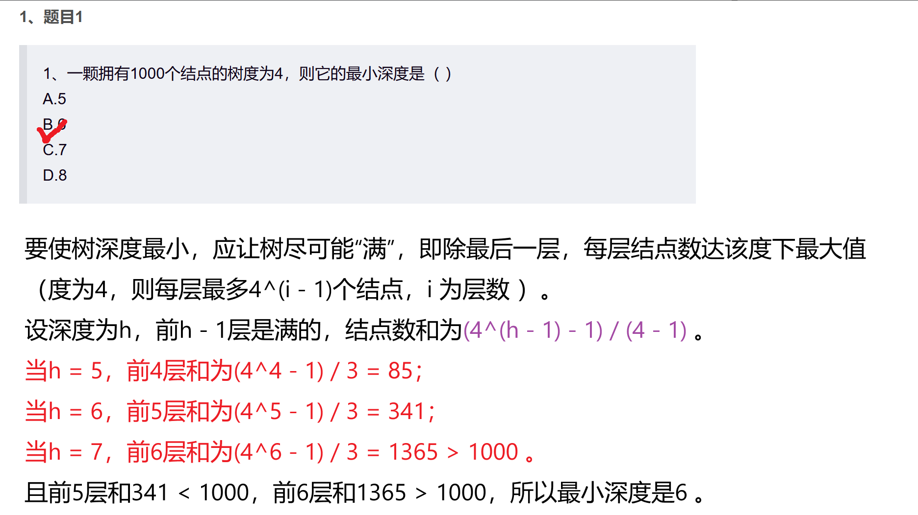 1、一颗拥有1000个结点的树度为4,则它的最小深度是( ) A.5 B.6 C.7 D.8