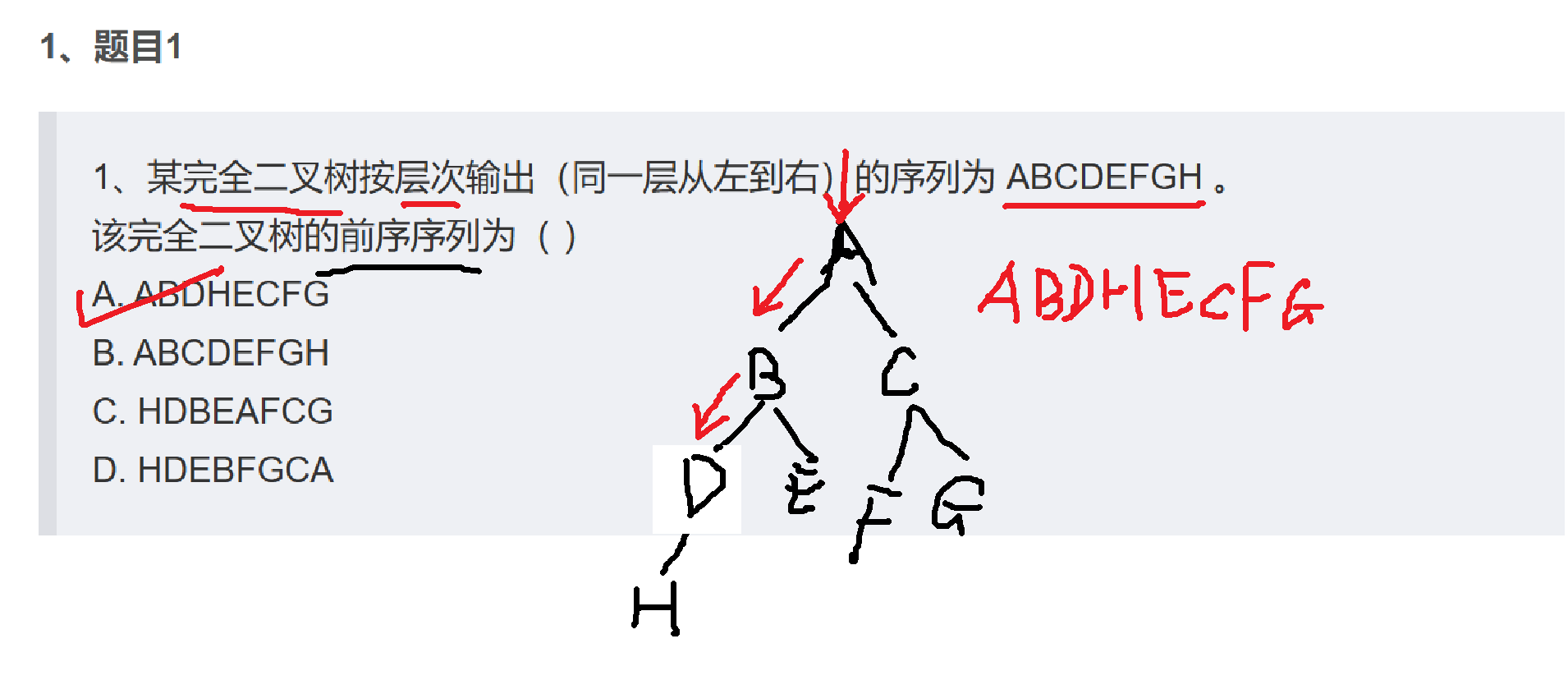 1、某完全二叉树按层次输出(同一层从左到右)的序列为 ABCDEFGH 。 该完全二叉树的前序序列为( ) A. ABDHECFG B. ABCDEFGH C. HDBEAFCG D. HDEBFGCA
