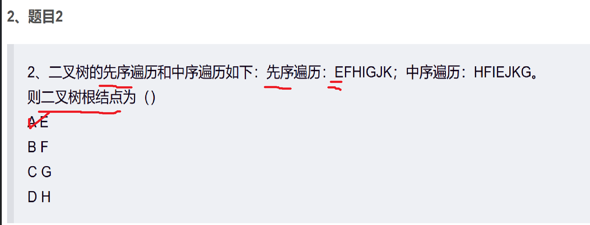 2、二叉树的先序遍历和中序遍历如下:先序遍历:EFHIGJK;中序遍历:HFIEJKG。 则二叉树根结点为() A E B F C G D H