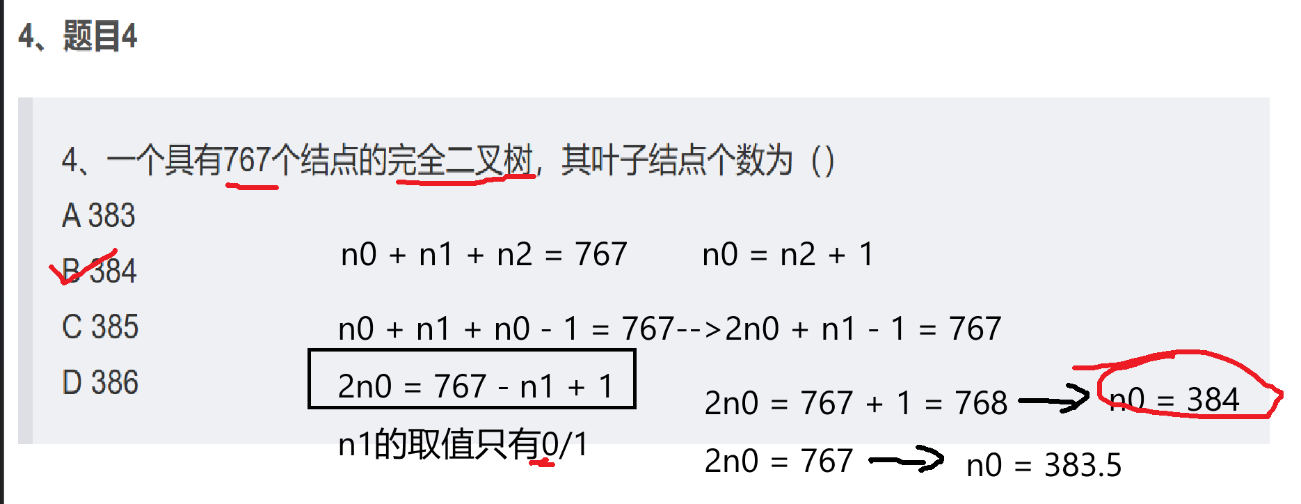 4、一个具有767个结点的完全二叉树,其叶子结点个数为() A 383 B 384 C 385 D 386