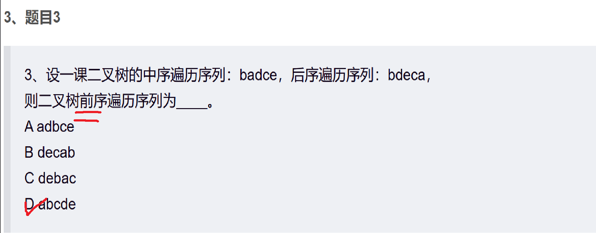 3、设一课二叉树的中序遍历序列:badce,后序遍历序列:bdeca, 则二叉树前序遍历序列为____。 A adbce B decab C debac D abcde