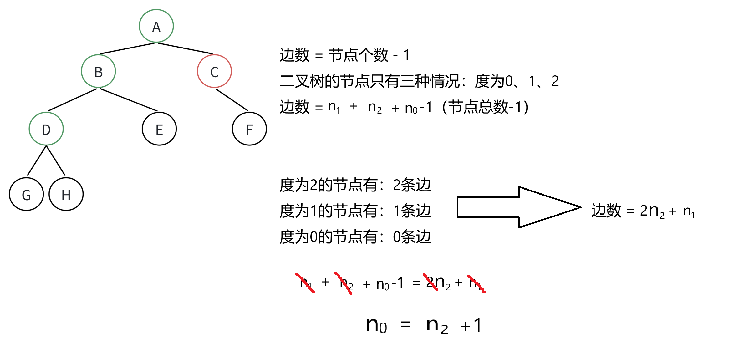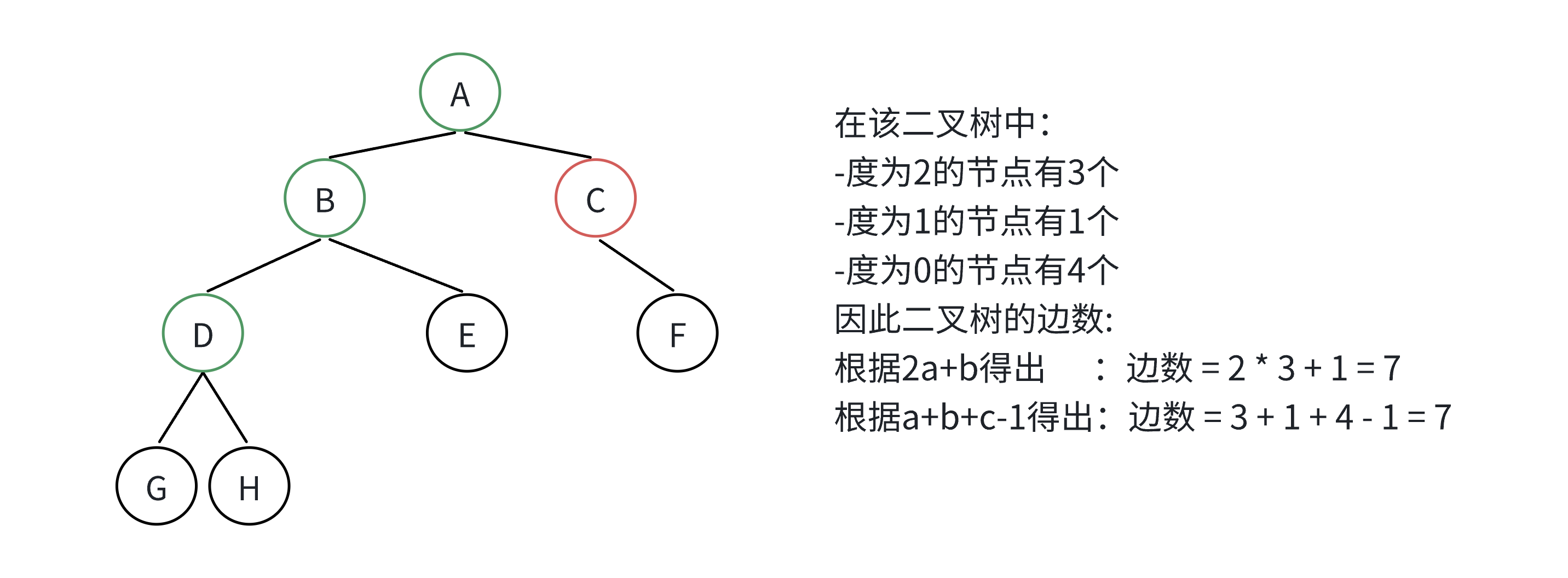 假设一个二叉树有 a 个度为2的节点,b 个度为1的节点,c 个叶节点,则这个二叉树的边数是 2a+b,另一方面,由于共有 a+b+c 个节点,所以边数等于 a+b+c-1。