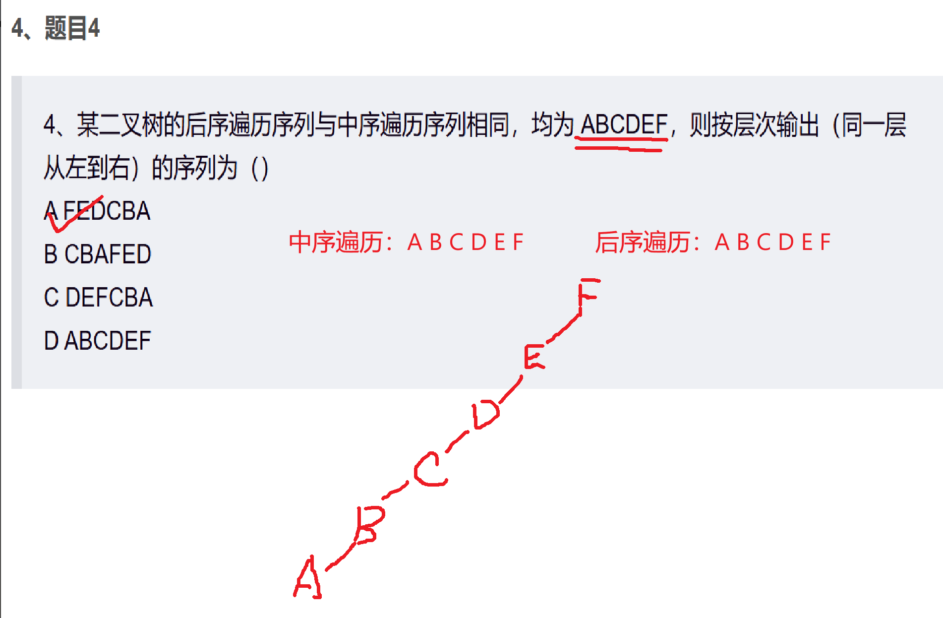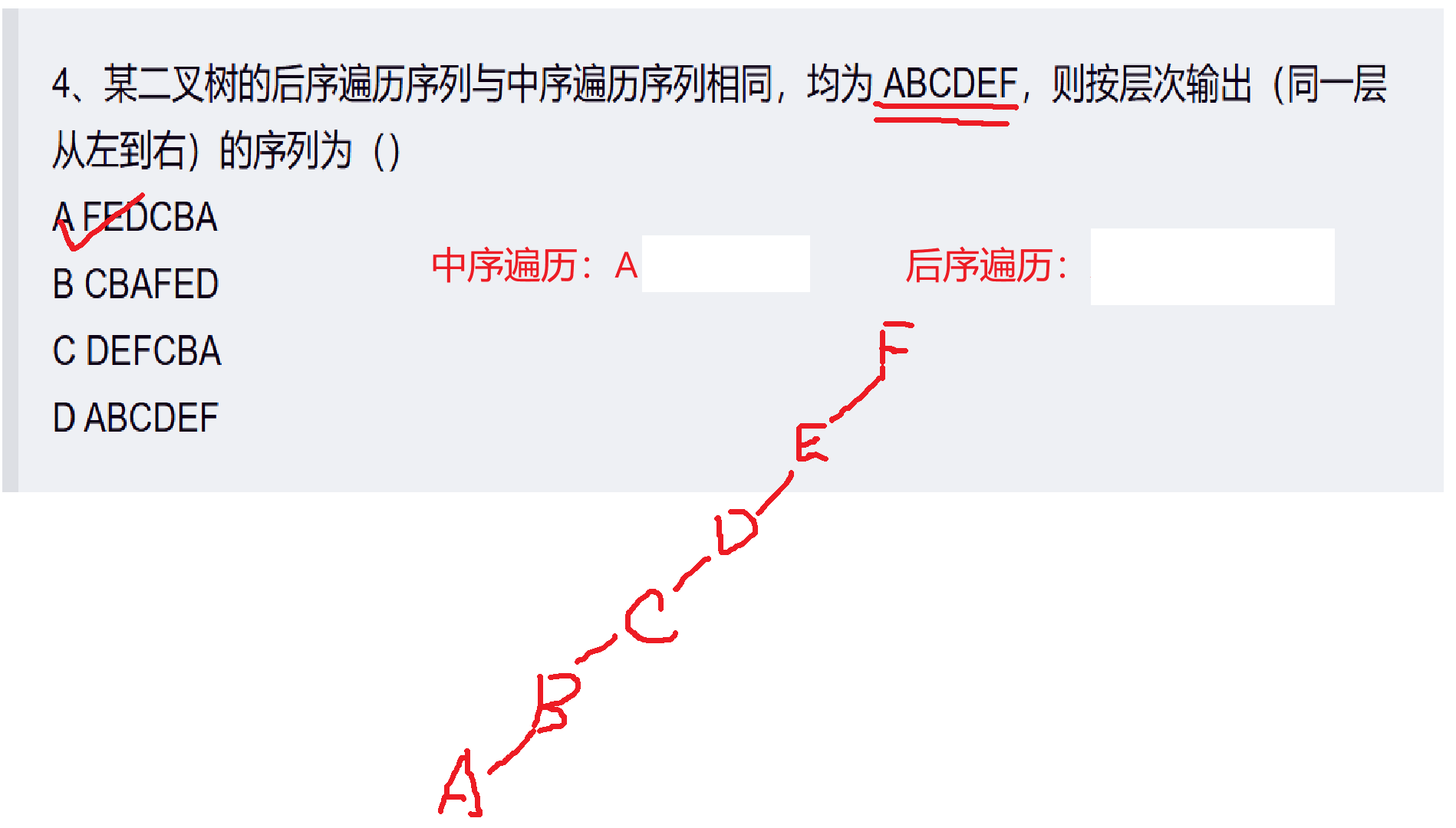 4、某二叉树的后序遍历序列与中序遍历序列相同,均为 ABCDEF,则按层次输出(同一层从左到右)的序列为() A FEDCBA B CBAFED C DEFCBA D ABCDEF