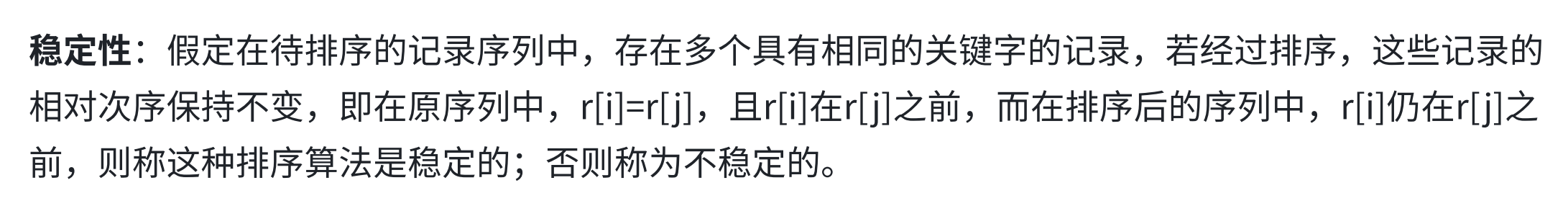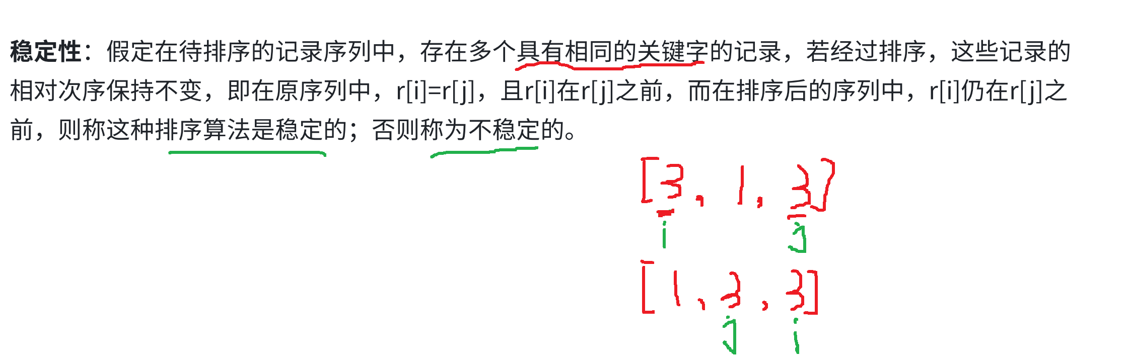 这里有两个3,我们经过排序,原数组中下标为 i 的3跑到了在原数组在它后面的下标为 j 的3的后面,这个就叫做不稳定,反过来,如果下标顺序没有改变,就是稳定。