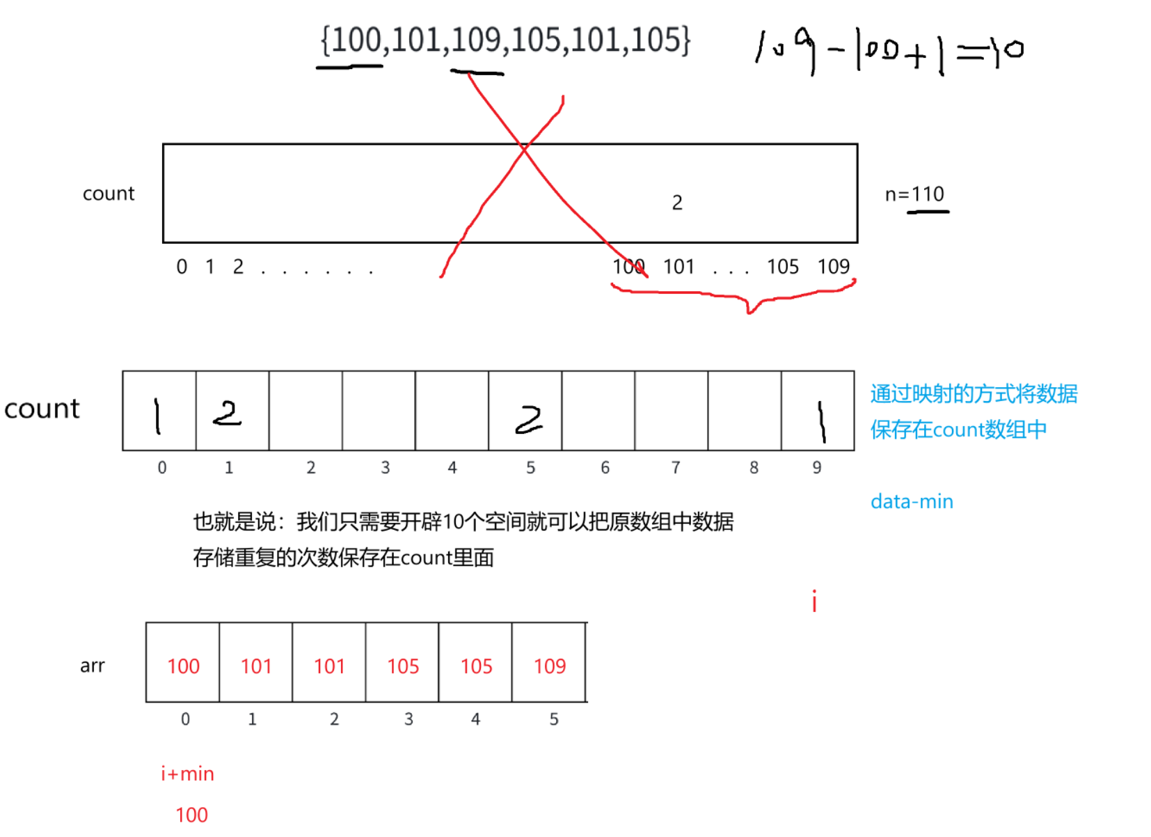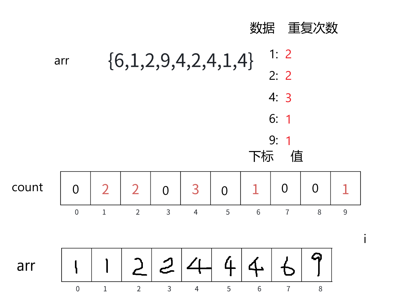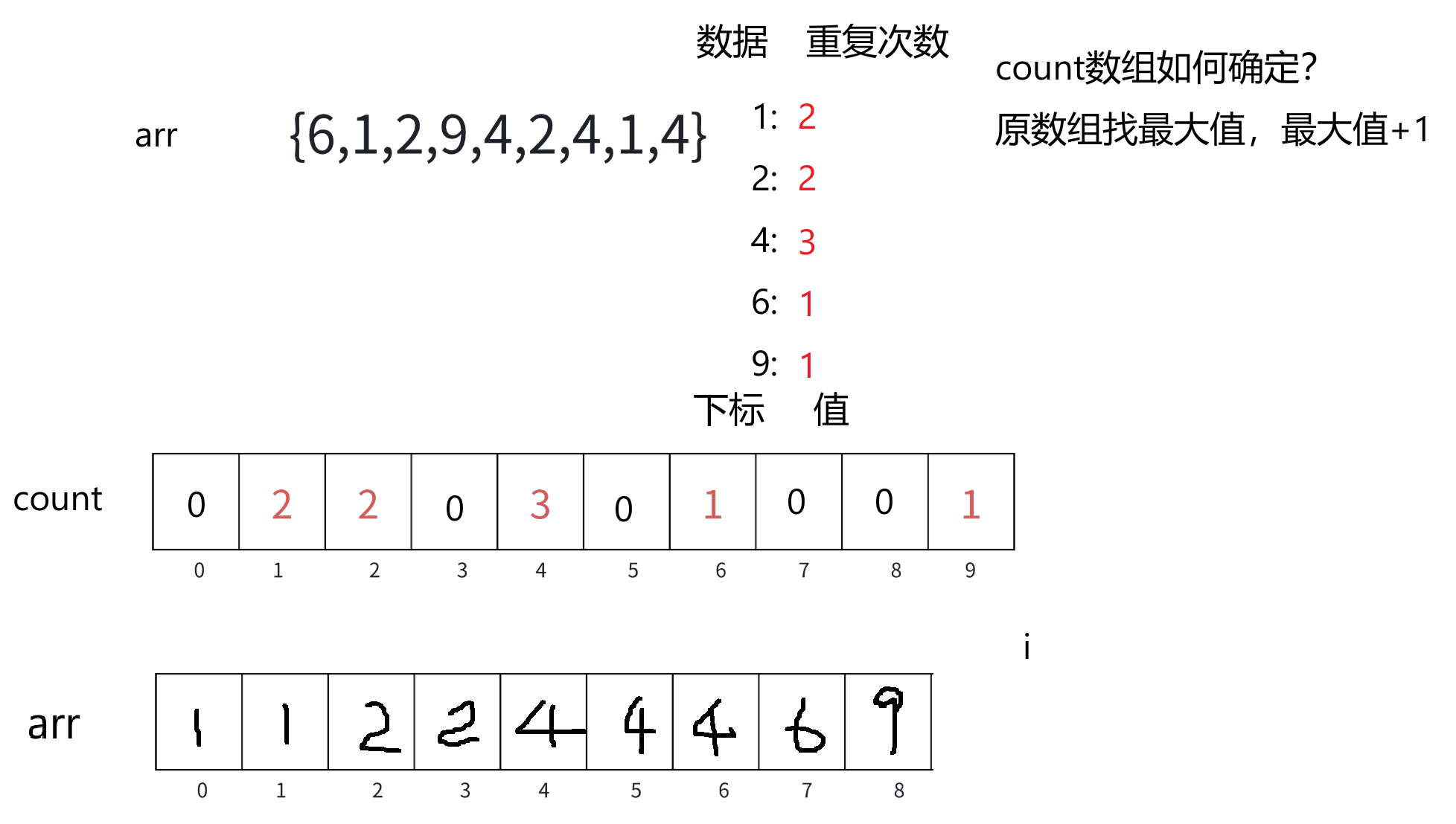 也就是说:我们只需要开辟10个空间就可以把原数组中数据存储重复的次数保存在count里面。