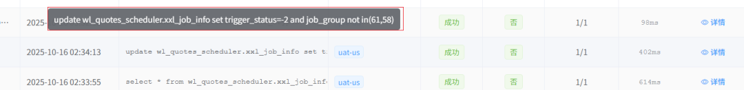 SET trigger_status =(-AND(job_group NOTIN(,)))所以整张表的 trigger_status 被批量改了 。
