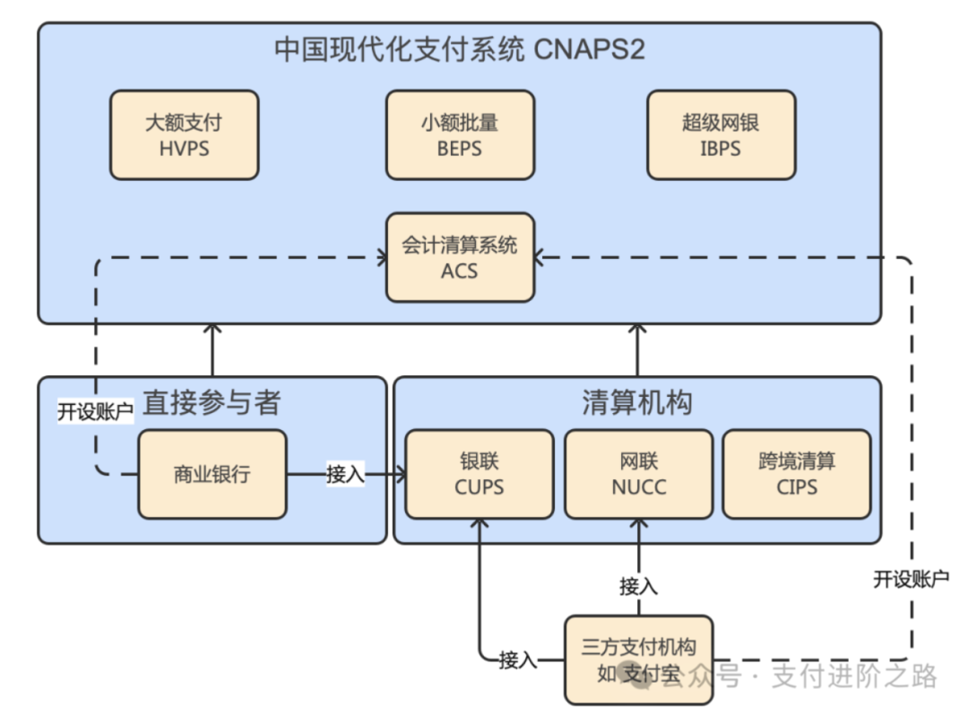 实际上这里的复杂性并不来自于清算流程,而是对清算关系的分析,谁是主动清算,谁是被动清算。我们以上面的资金通路二为例,来捋一捋整个链路中所有机构间的清算关系: