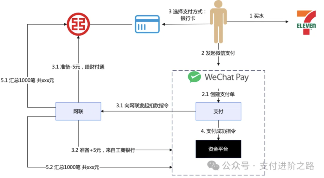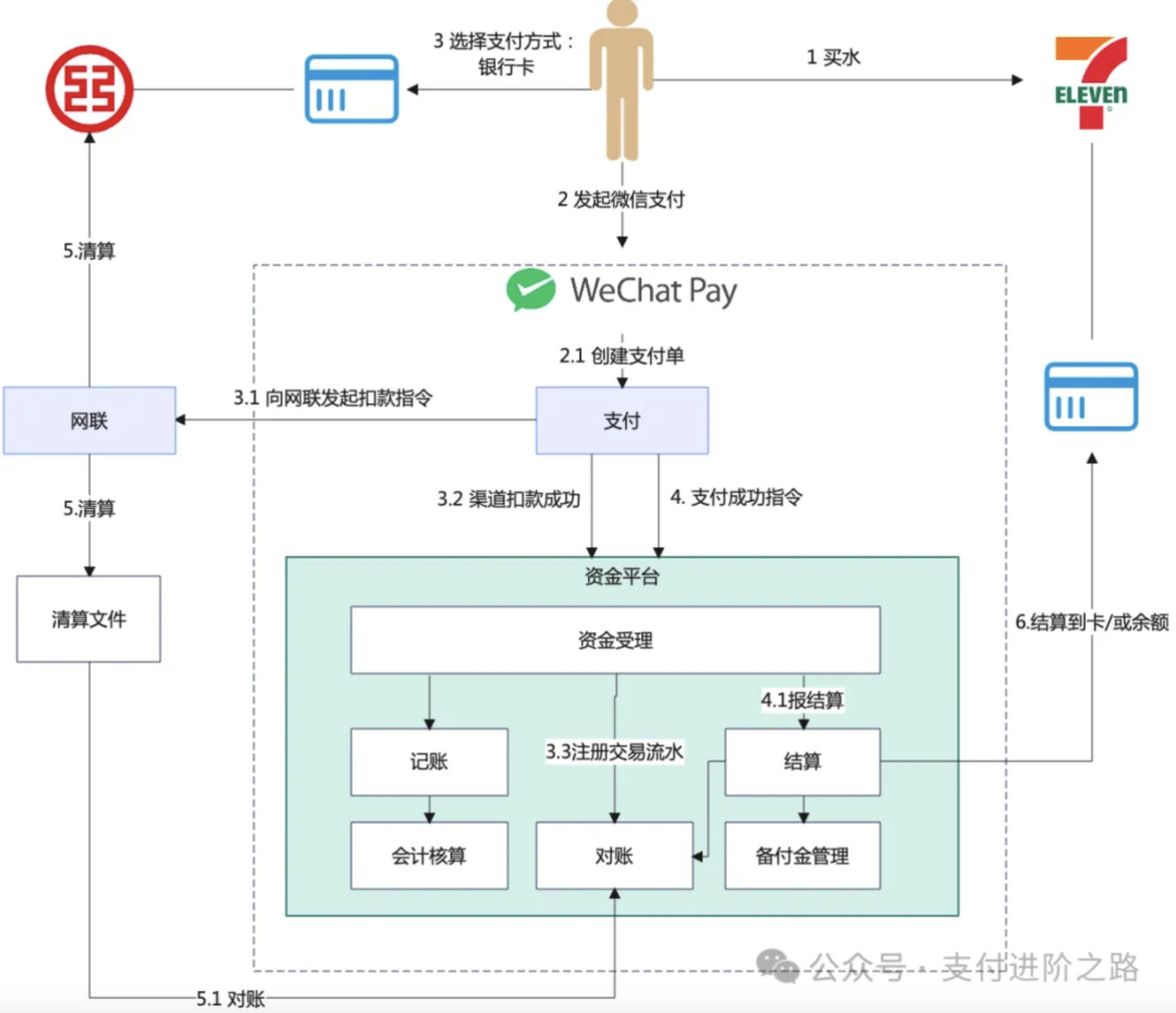 资金从小明的银行卡到711商户要分几步?咱们来一步步分析: