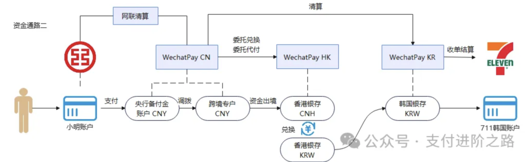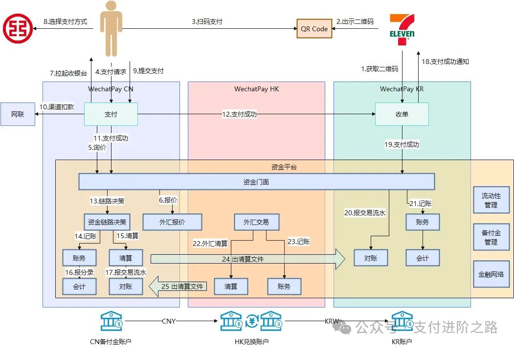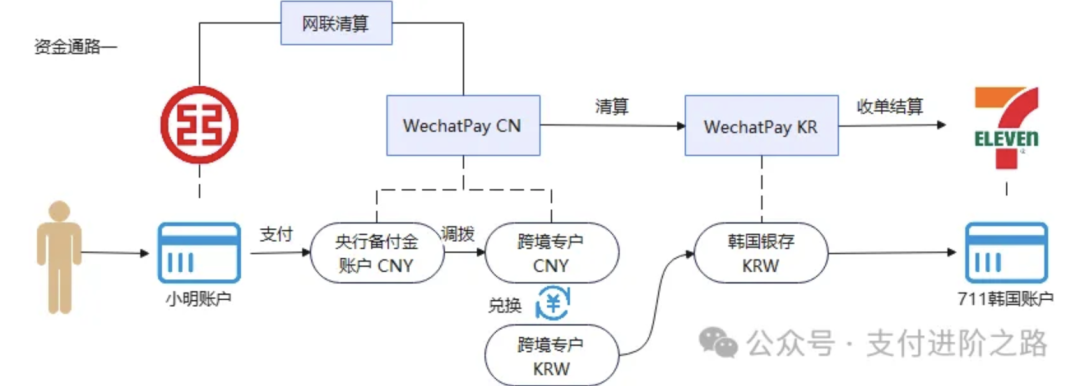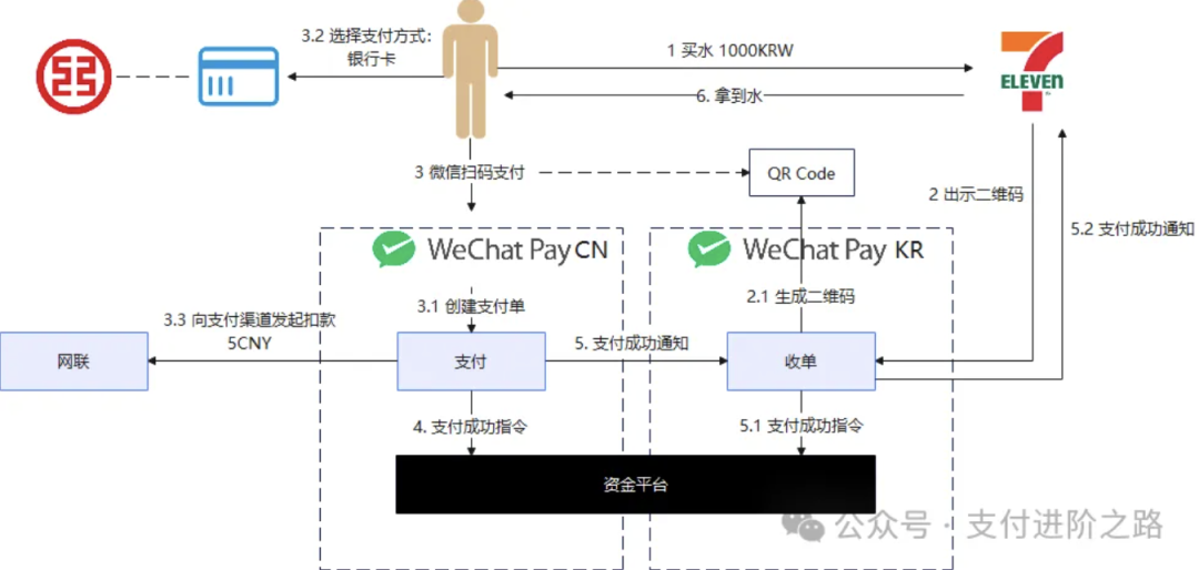 通常来说,二维码是收单机构提供的,由于国内的微信支付同时提供了支付和收单能力,因此平时不太需要关注这个问题。但是在跨境支付中,必须有一个收单机构来为韩国商户提供收单服务,我们现在假设是由“微信支付-韩国”这个主体来提供收单服务。再把上面的图扩展一下: