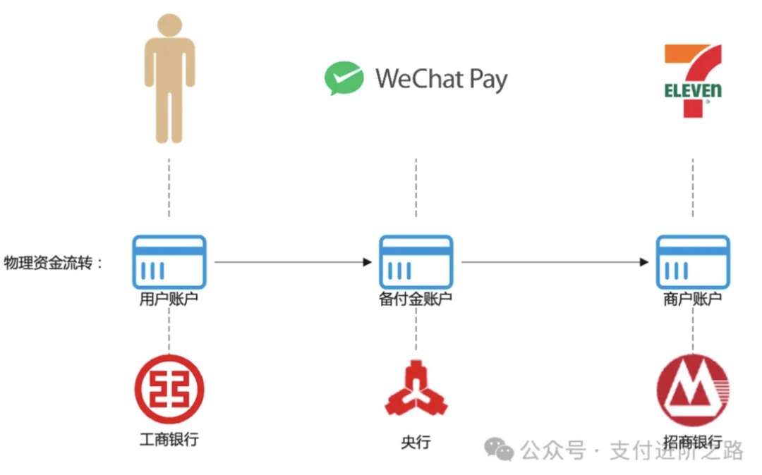 银行当然不会直接对接711,中间需要经过微信支付进行中转,根据央行的规定,第三方支付的资金都需要受到两联(银联、网联)监管,微信支付需要在央行开设一个备付金账户,所有未结算的资金都会沉淀在备付金账户里。