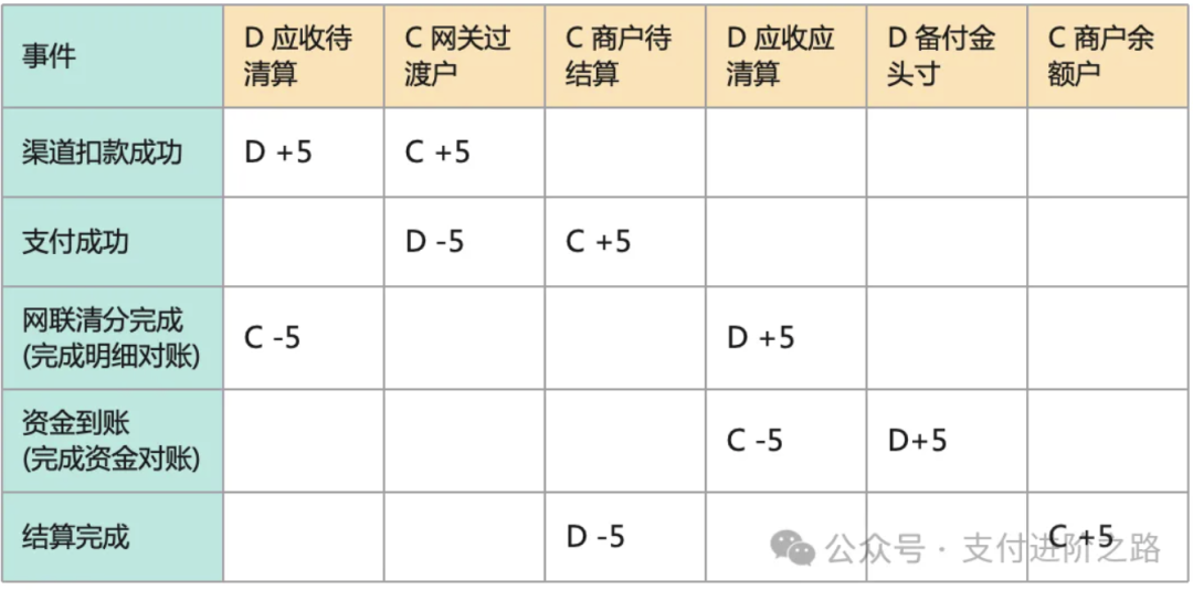 我们尝试还原一下完整的记账过程,注意记账是以支付公司的视角去记的(假定商户是结算到余额):