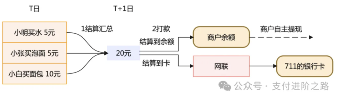 如果结算到余额,直接商户余额+20,如果结算到卡,根据行业规范要求信息流需要经过网联,再由网联进行统一清算。
