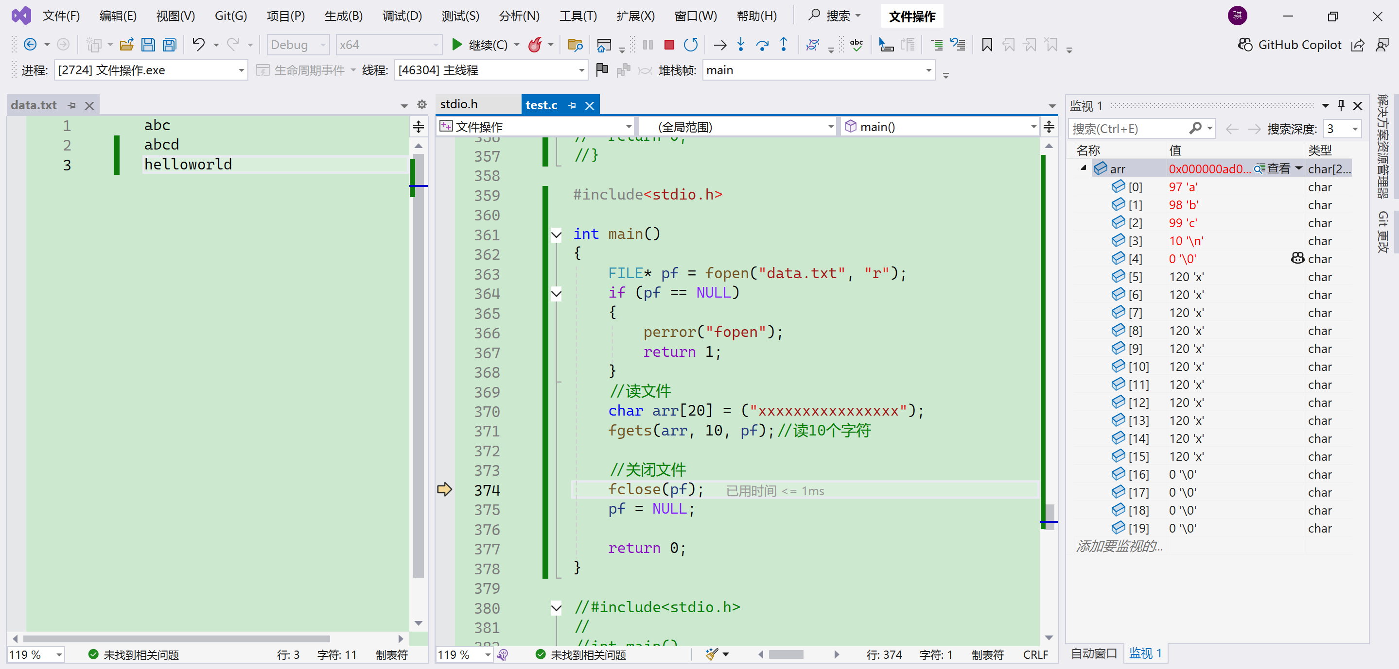 }代码这样写可以让我们在监视窗口明显观察到fgets的特点。