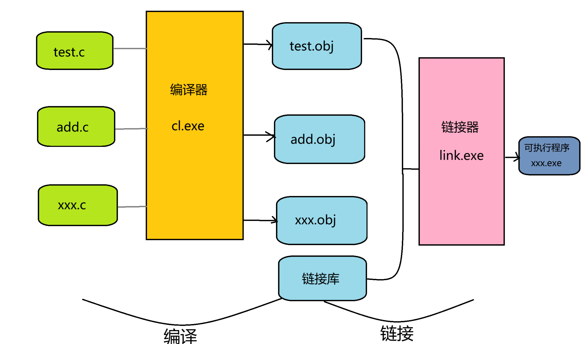 1、多个.c文件单独经过编译器,编译处理生成对应的目标文件;