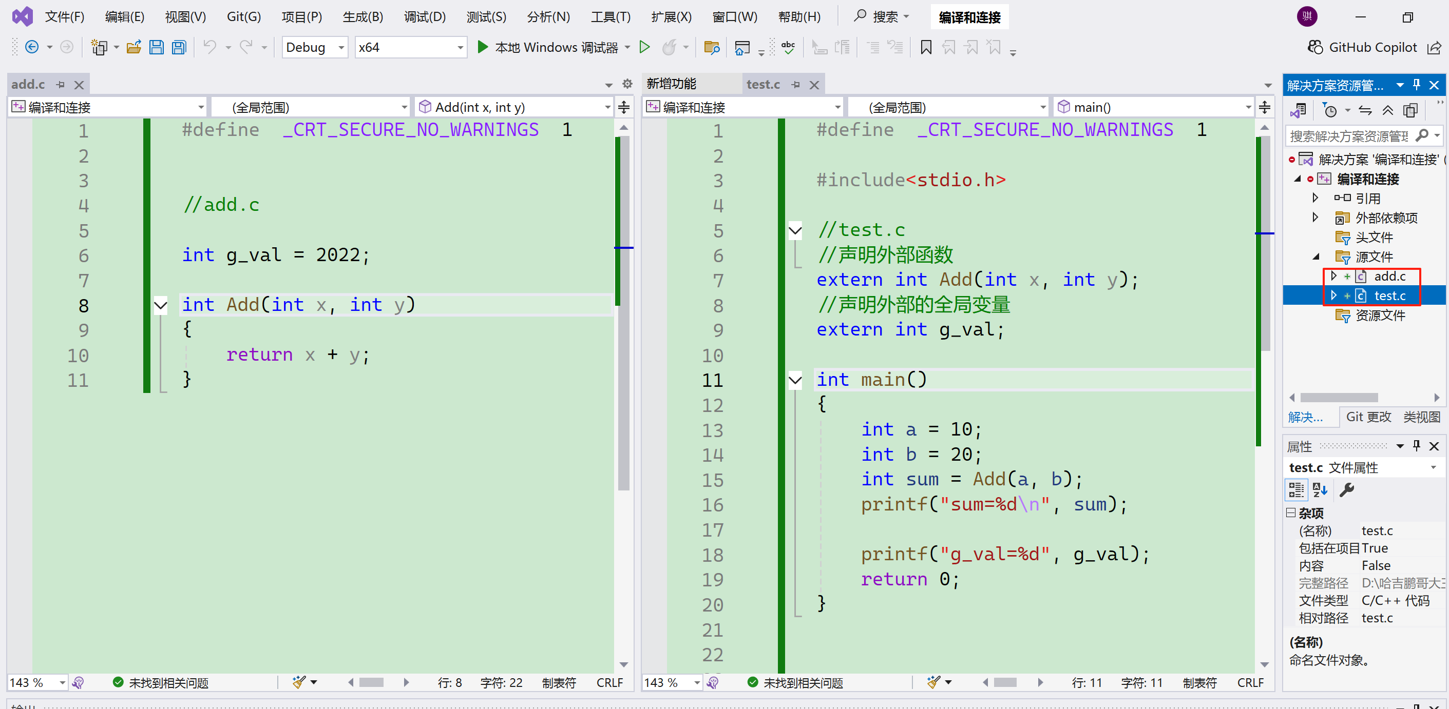 打个比方,在一个C的项目中有两个.c文件(分别是test.c和add.c),代码如下所示: