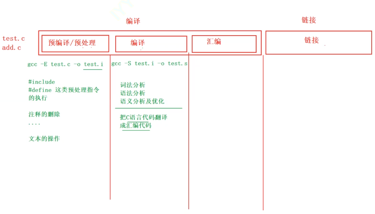 编译过程就是将预处理后的文件进行一系列的处理,包括:词法分析、语法分析、语义分析及优化,生成相应的汇编代码文件。