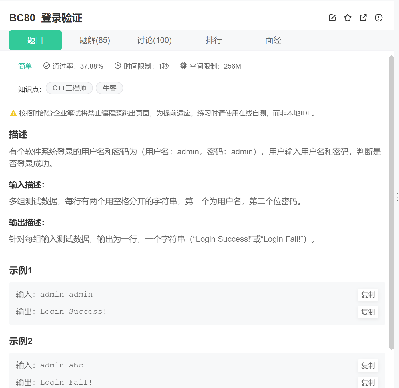 1、多组输入; 2、两个字符串比较大小不能使用==,得使用strcmp函数,比较的是两个字符串中对应字符的ASCII码值。