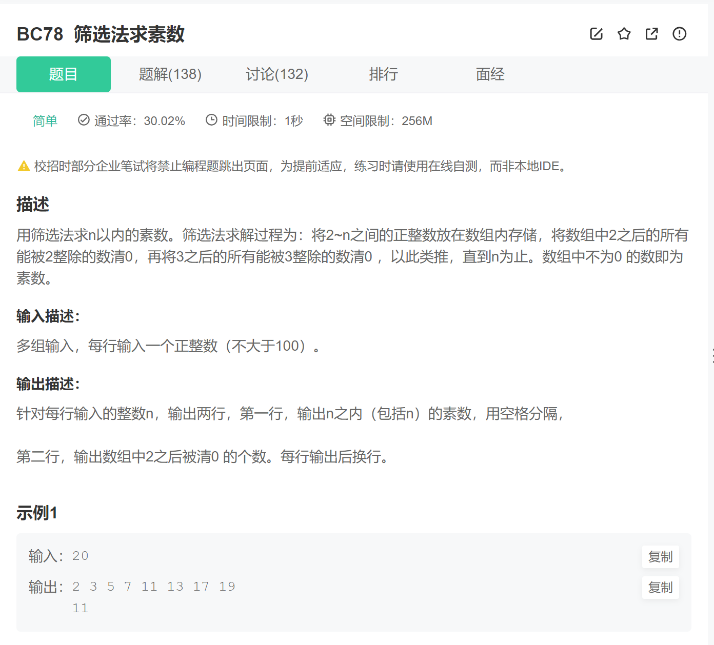这道题要求我们用筛选法求素数,我们用代码实现一下——