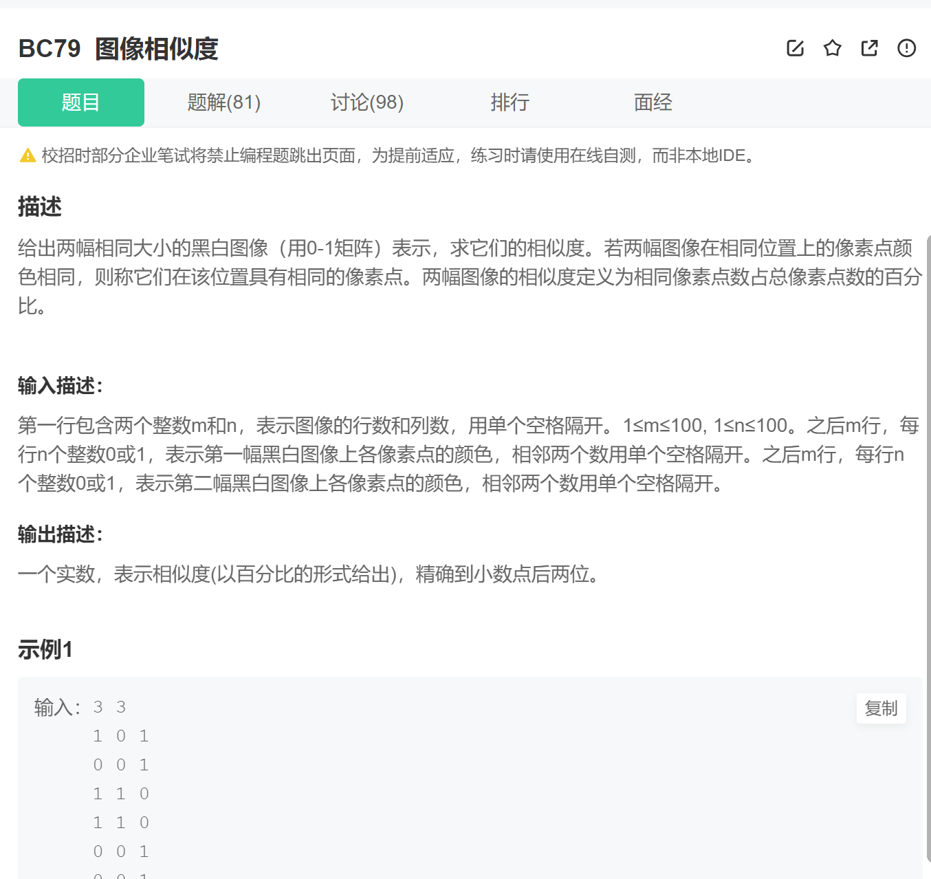1、输入二维数组; 2、求两个二维素组的相同元素个数; 3、求百分比要注意*100.0,小时点后保留2位。