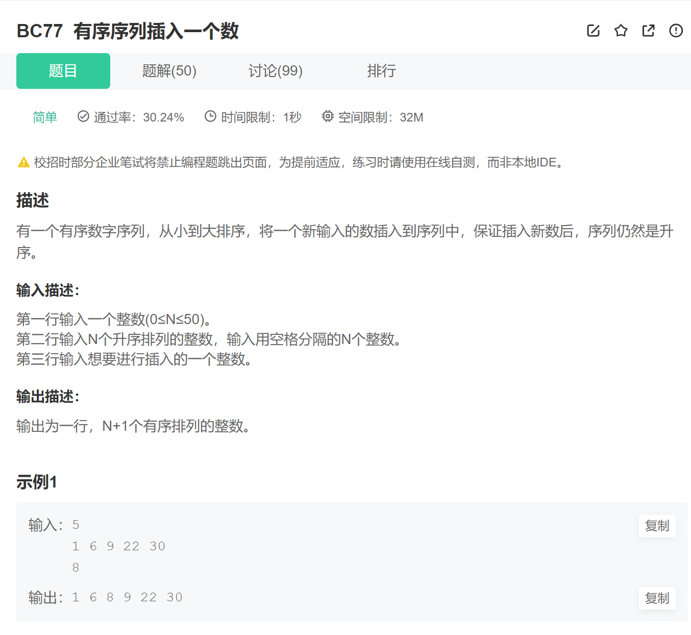1、注意多组输入; 2、从往前比较并一定数字找到合适的位置,就可以插入数字了,但是如果插入的数字比所有的元素都小,那就插入到第一个位置上。